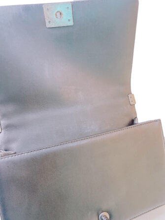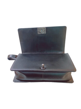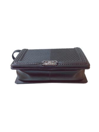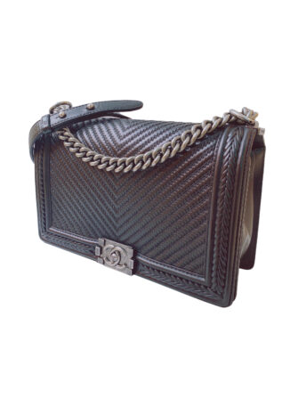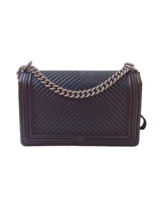This chic shoulder bag features smooth luxurious calfskin leather in black. It features a chain-embellished chevron quilting framed by linear quilting, a dark silver chain link and shoulder pad shoulder strap with a dark silver Boy CC closure at the flap. This opens to a beige grosgrain fabric interior with room for essentials for daytime and evening wear with the timeless quality and style only from Chanel!