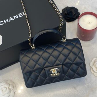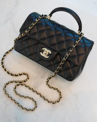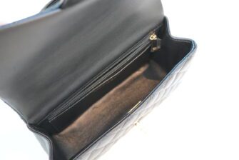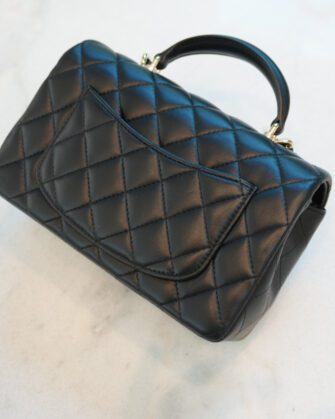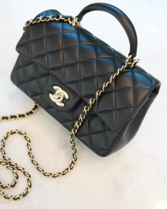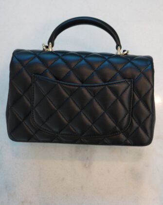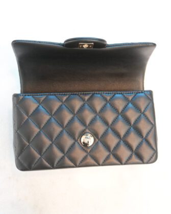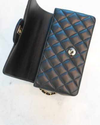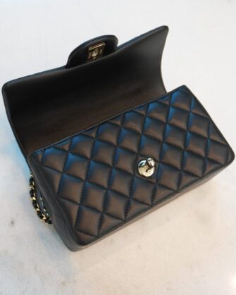 This Mini Rectangular flap bag is in Black lambskin with light gold tone hardware and has a front flap with signature CC turnlock closure, rear half moon pocket, top handle and single interwoven black leather and light gold tone chain link shoulder/crossbody strap.