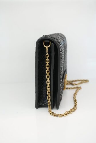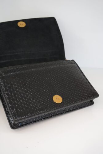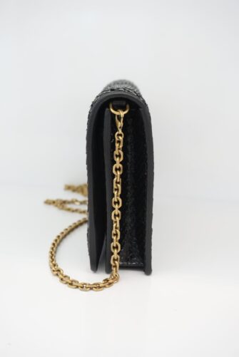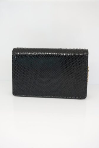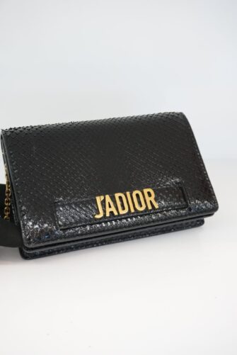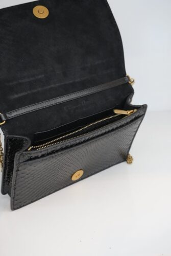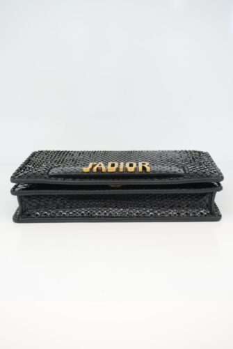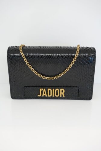 This chic shoulder bag is crafted of snakeskin leather in black. The shoulder bag features an aged gold chain link shoulder strap and a leather front strap with the bold letters spelling J’adior. This opens to a suede leather interior with card slots and zipper and patch pockets.