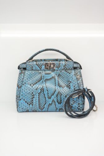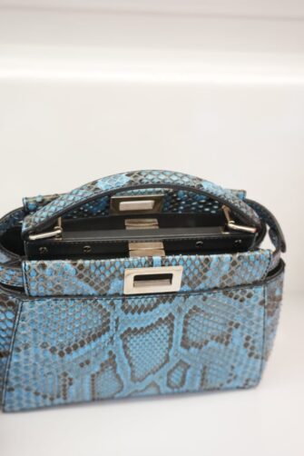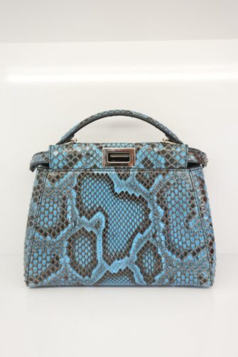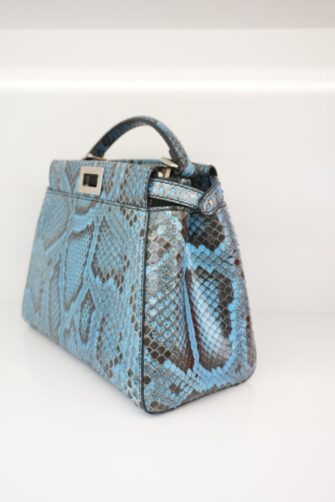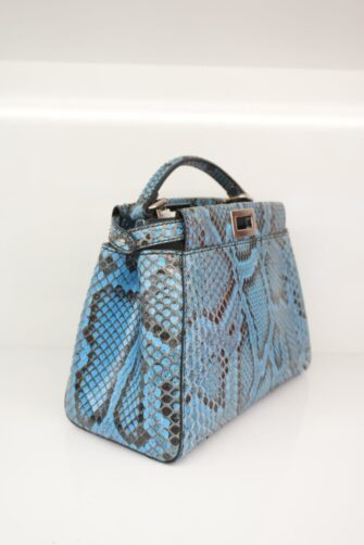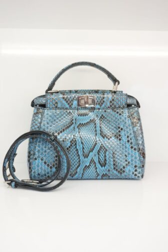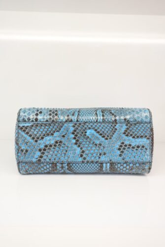 This beautiful handbag tote is crafted of blue snakeskin. The bag features a sturdy, reinforced leather top handle with silver links, an optional matching adjustable shoulder strap and expandable sides. A silver turn lock opens on either side to a blue leather interior with a zipper and patch pocket.