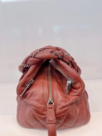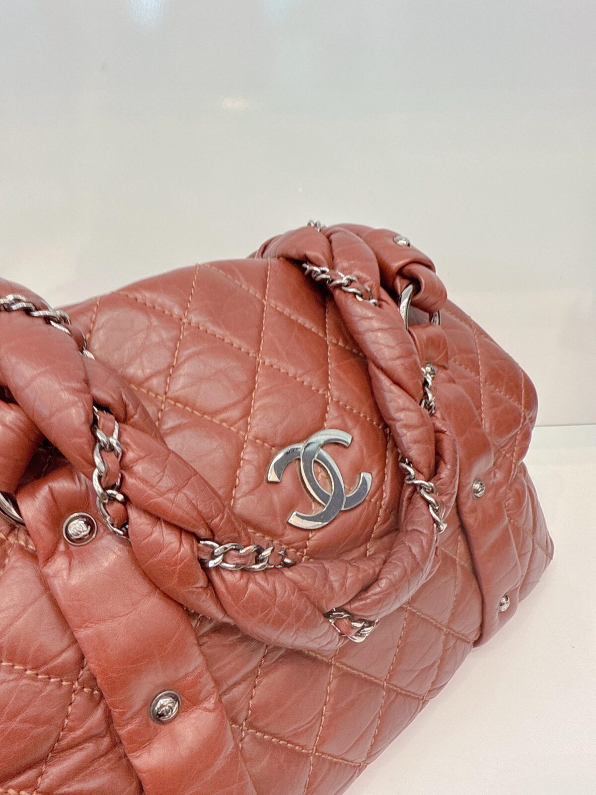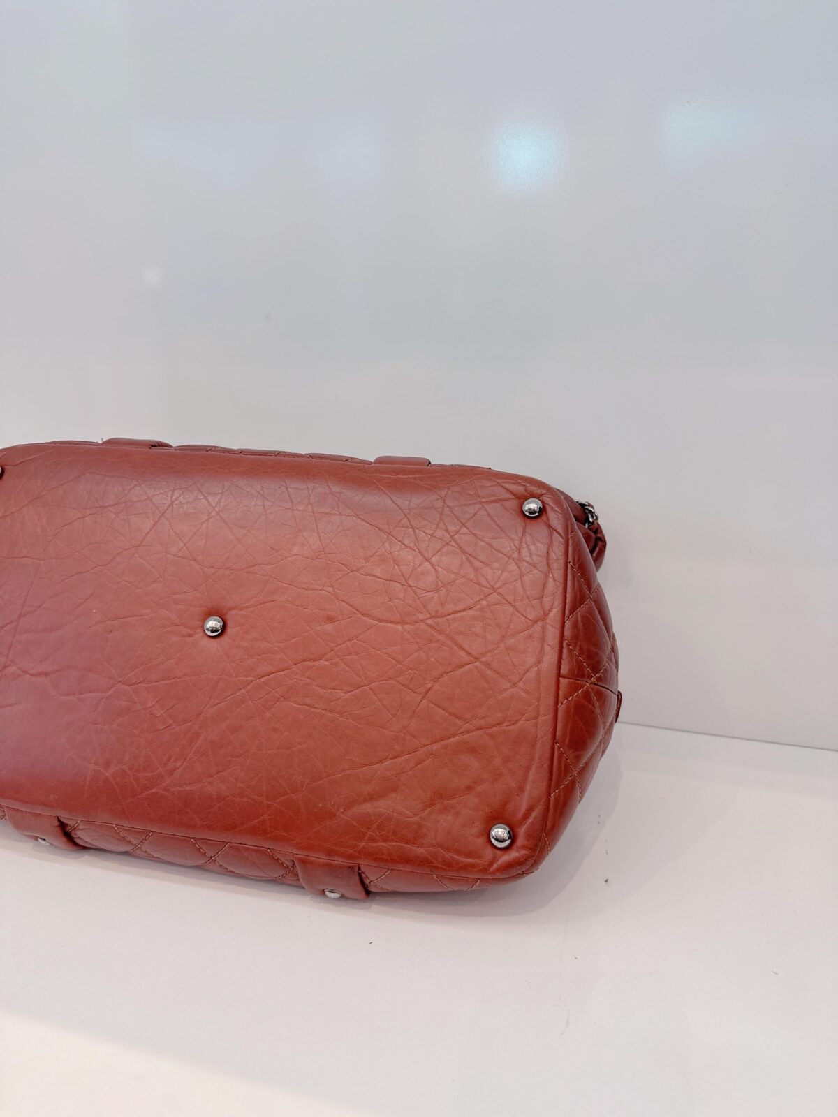 This sophisticated tote is beautifully crafted of distressed, diamond-quilted lambskin leather in brown. The shoulder bag features, exterior zipper compartments, leather braided strap handles with a silver chain, and a silver Chanel CC logo embellishment on the sides. The top zips open to a beige fabric interior with a flat pocket.