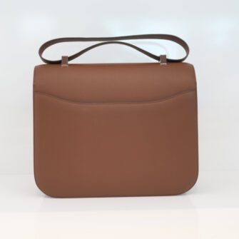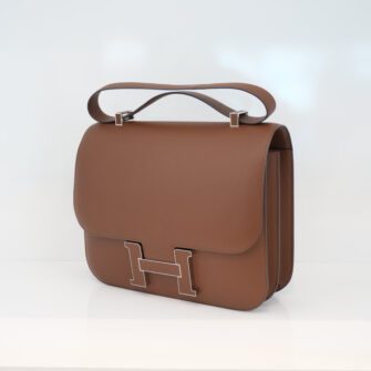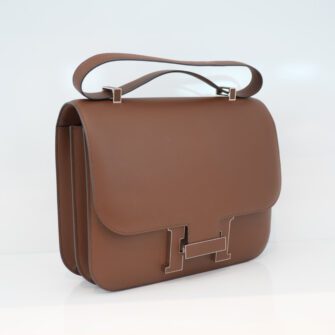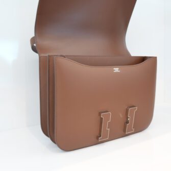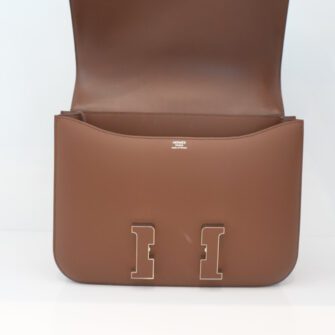 This stunning hop handle bag is crafted of fine matte calfskin leather in brulee. The bag features a uniquely constructed looping handle strap with silver links. The top flap tucks into a prominent H in palladium hardware with leather inlay. This opens to a leather interior with an expandable zipper pocket.