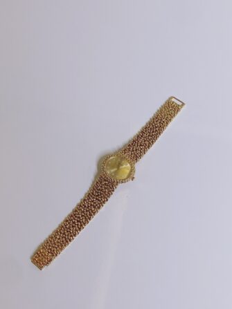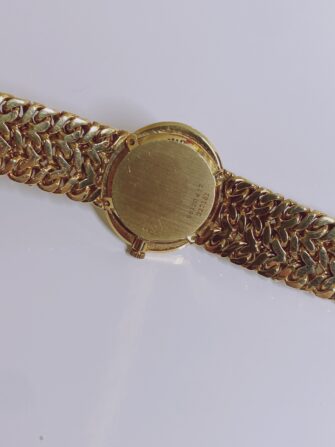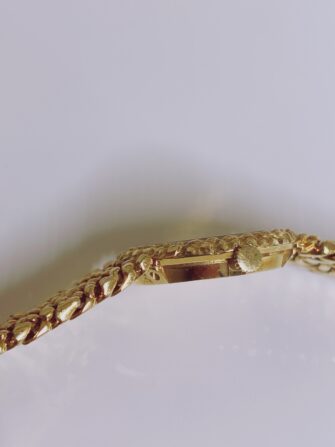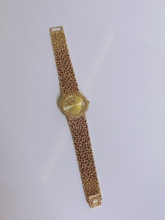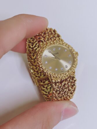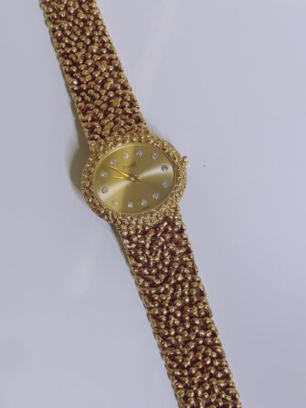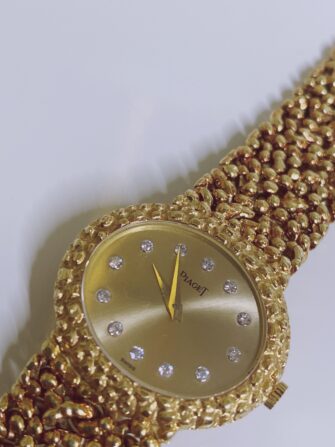 An extremely rare and highly attractive this is a 1970’s 18K gold “nugget” Piaget dial diamond watch. Precious metal and hard stone; this is vintage Piaget at its best. Bold texture and nugget bracelet is what makes this watch extra special.