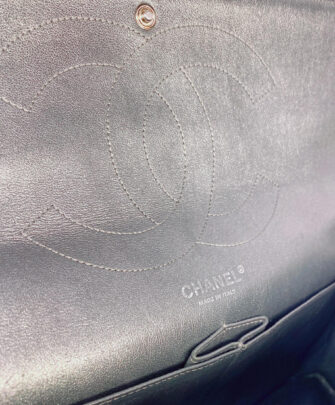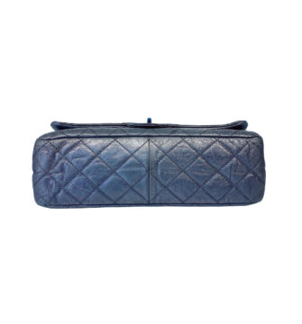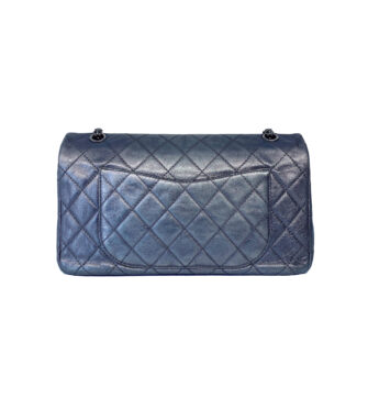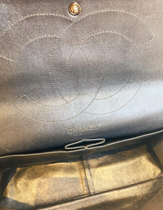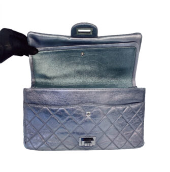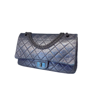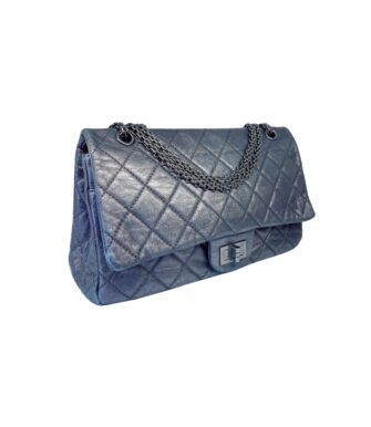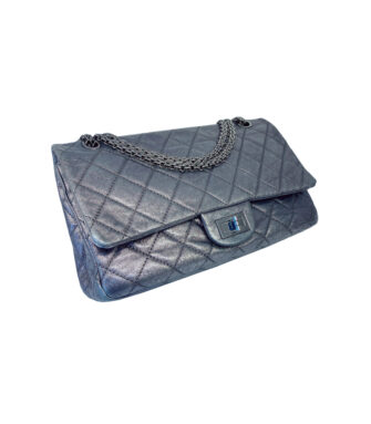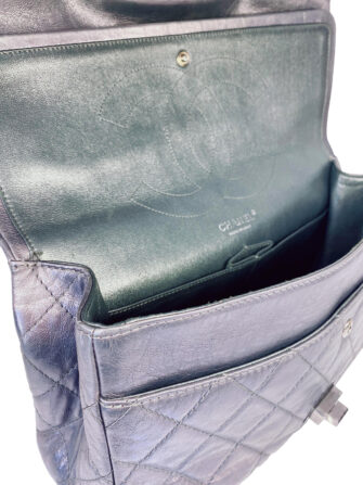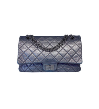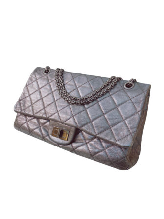 This is a stylish reissue from Chanel made of gorgeous diamond quilted aged calfskin leather in metallic gray. The bag features tightly linked bijoux aged ruthenium shoulder chains which compliment the aged ruthenium Chanel Mademoiselle turn lock. This opens to a smaller flap and an interior of matte leather with patch pockets.