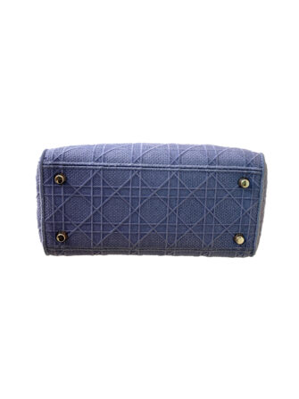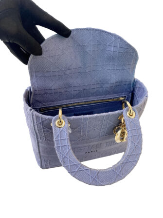 This stylish handbag tote is finely crafted of embroidered light blue Cannage canvas with a ‘Christian Dior’ signature on the front and features fabric top handles and shoulder strap with gold hardware, including a Dior letters charm. The top opens to a Dior monogram fabric interior with a zipper pocket.