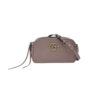 This shoulder bag is crafted of metallic calfskin leather in silver with studs and pearls. This bag features an aged-gold chain and leather shoulder strap with a front interlocking GG logo incrusted with small faux pearls. The bag opens to a pink satin interior with a patch pocket. This compact, yet spacious shoulder bag is perfect for anytime of the day; whether it be for casual or formal wear, from Gucci!