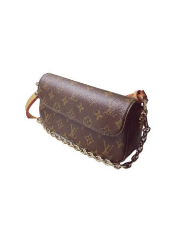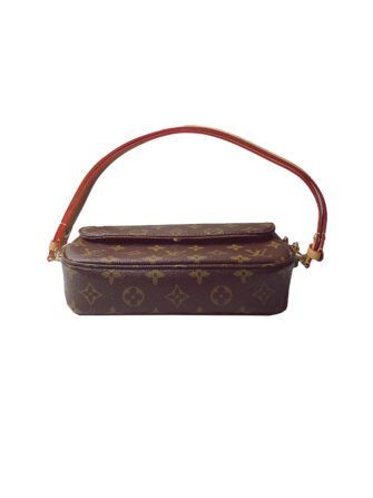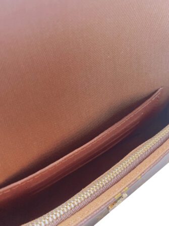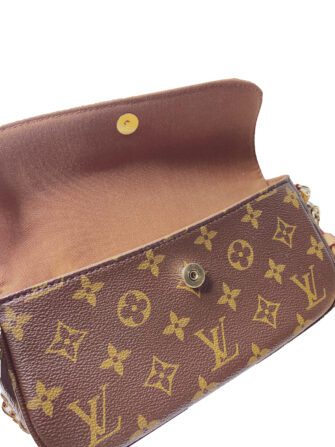 Crafted of monogram coated canvas. The bag features a front-facing flap, a gold chain strap and an optional adjustable vachetta leather shoulder strap. The flap opens to fabric interior with three card slots, a flat pocket and a zipped compartment.