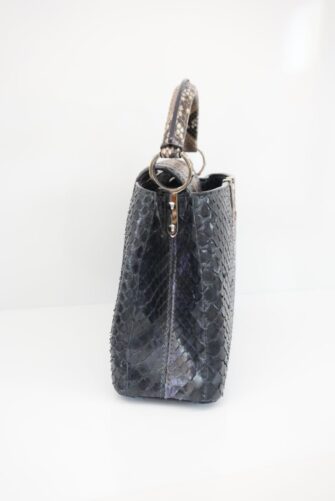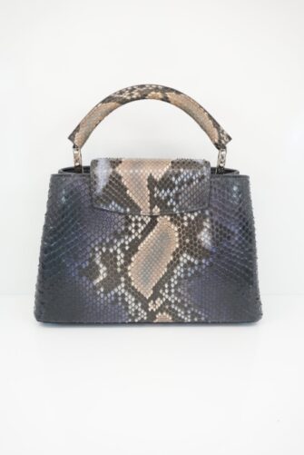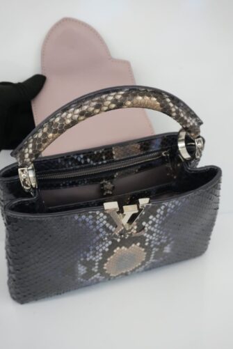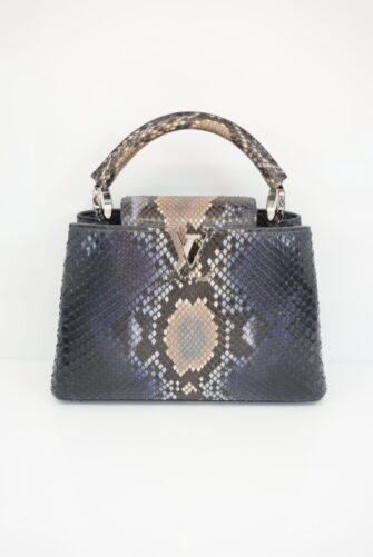 This beautiful bag is composed of luxurious snakeskin in navy and beige tones. The handbag features a single rolled snakeskin reinforced top handle, an optional shoulder strap, stylized links and a crossover flap that inserts behind the prominent LV. The interior is a beige leather creating a luxury style for day or evening from Louis Vuitton.
