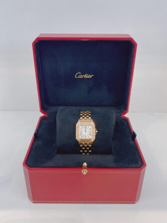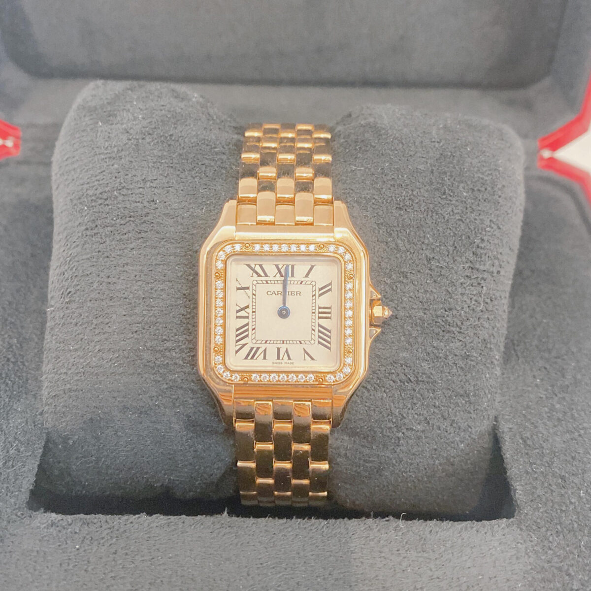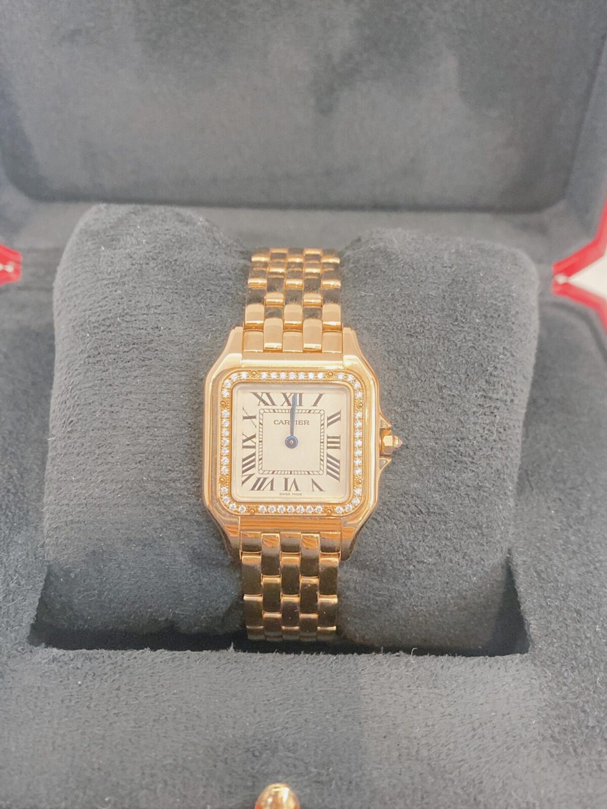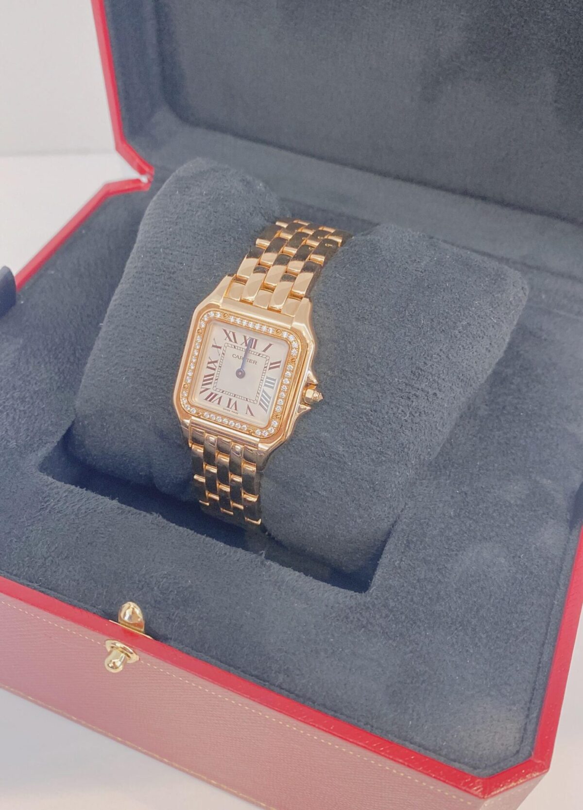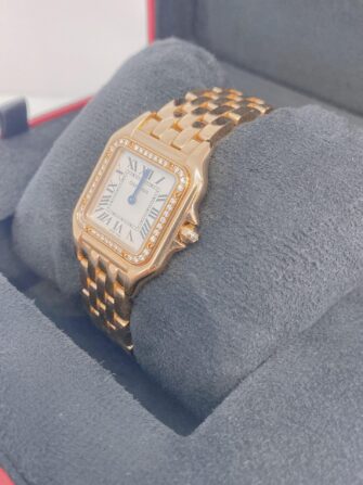 Panthère de Cartier watch, medium model, quartz movement. Case in rose gold 750/1000 set with brilliant-cut diamonds, dimensions: 27 mm x 36 mm, thickness: 6 mm, crown set with a diamond, silvered dial, blued-steel sword-shaped hands, rose gold 750/1000 bracelet, water-resistant