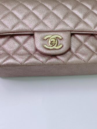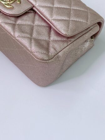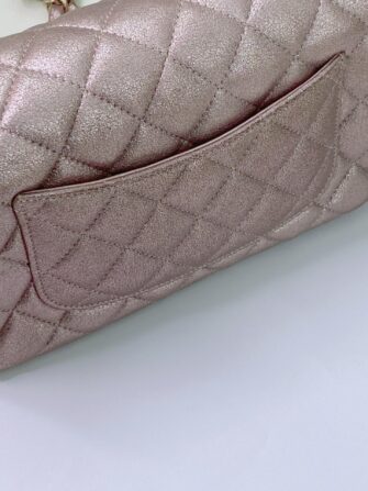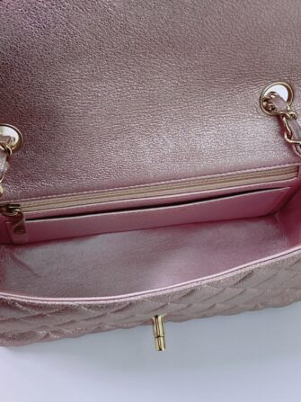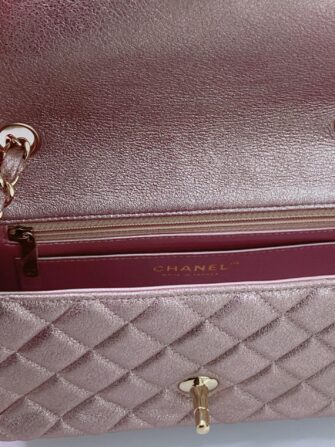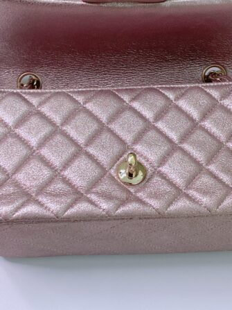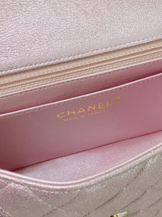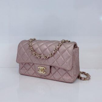 This stunning baguette is finely crafted of diamond quilted metallic pink goatskin leather with a lustrous sheen. The bag features a gold chain link shoulder strap threaded with leather and a frontal flap with a gold mademoiselle Chanel CC turn lock. This opens to an iredescent matching leather interior with zipper and patch pockets. This is a chic mini bag that takes you effortlessly from day to evening, only from Chanel!
