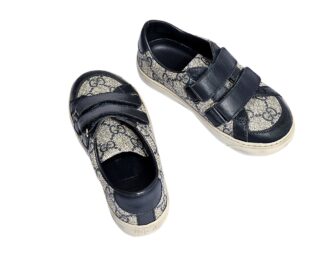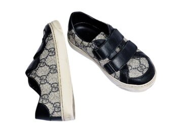 Gucci offers these Beige and brown ‘GG’ logo supreme canvas trainers, suitable for boys and girls. Their two strap fastening design is embellished with leather trim. The lining and inner sole are crafted from soft leather, and the rubber outsole is textured for additional grip. They have leather trims and fasten with two velcro straps. The lining and inner sole are in soft leather and the rubber sole is textured for added grip. Come with storage bag. Made in Italy.