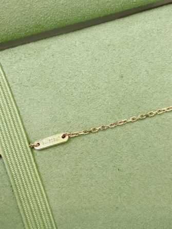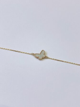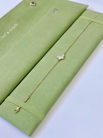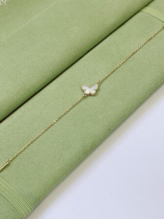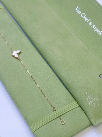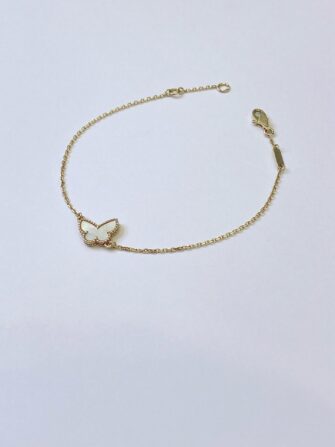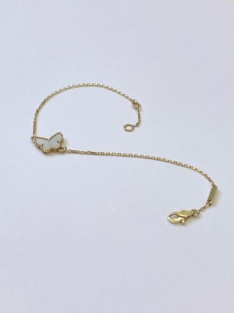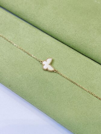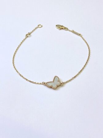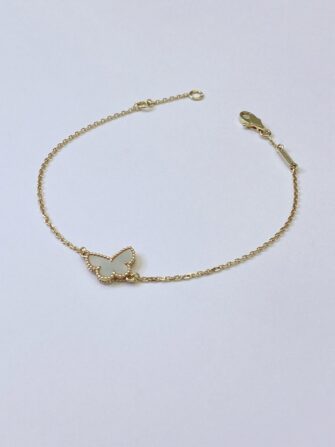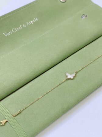 The Van Cleef & Arpels “Sweet Butterflies” charm bracelet is crafted from 18K yellow gold, featuring a whimsical design that adds a touch of charm and elegance.