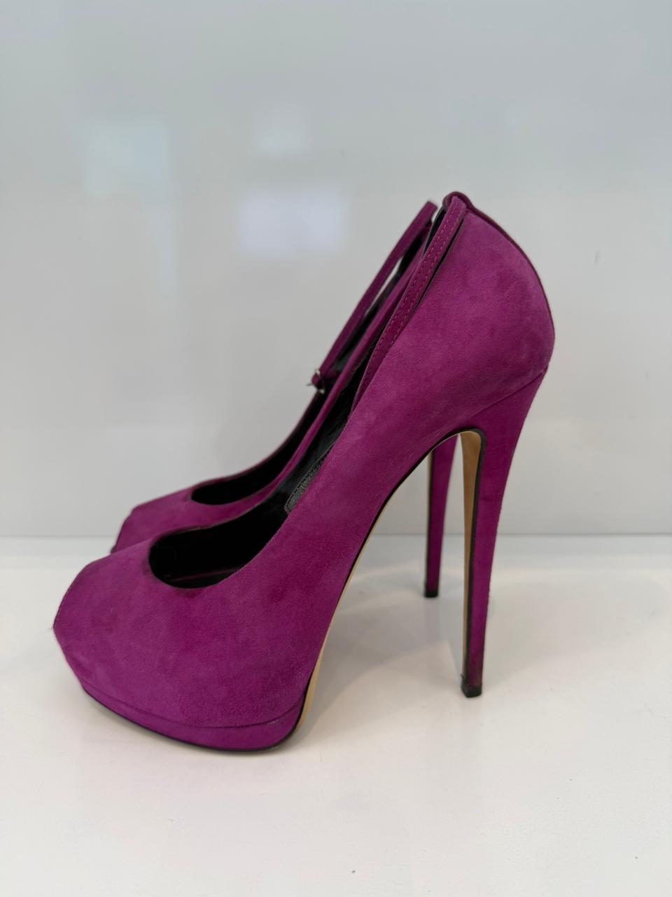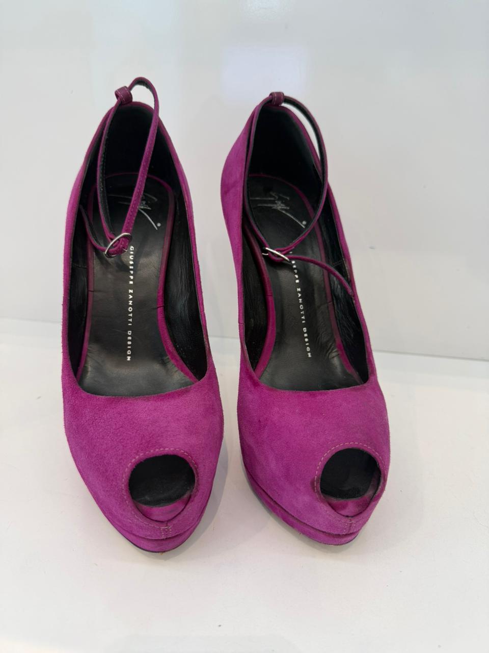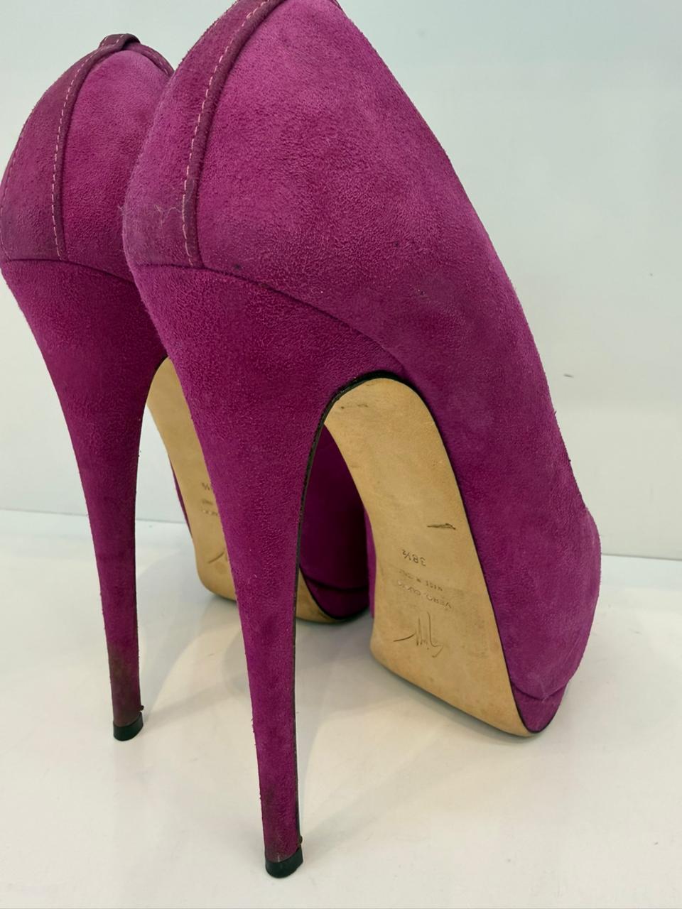 MAGENTA PINK SUEDE PLATFORM PEEP TOE ANKLE STRAP PUMPS 38.5