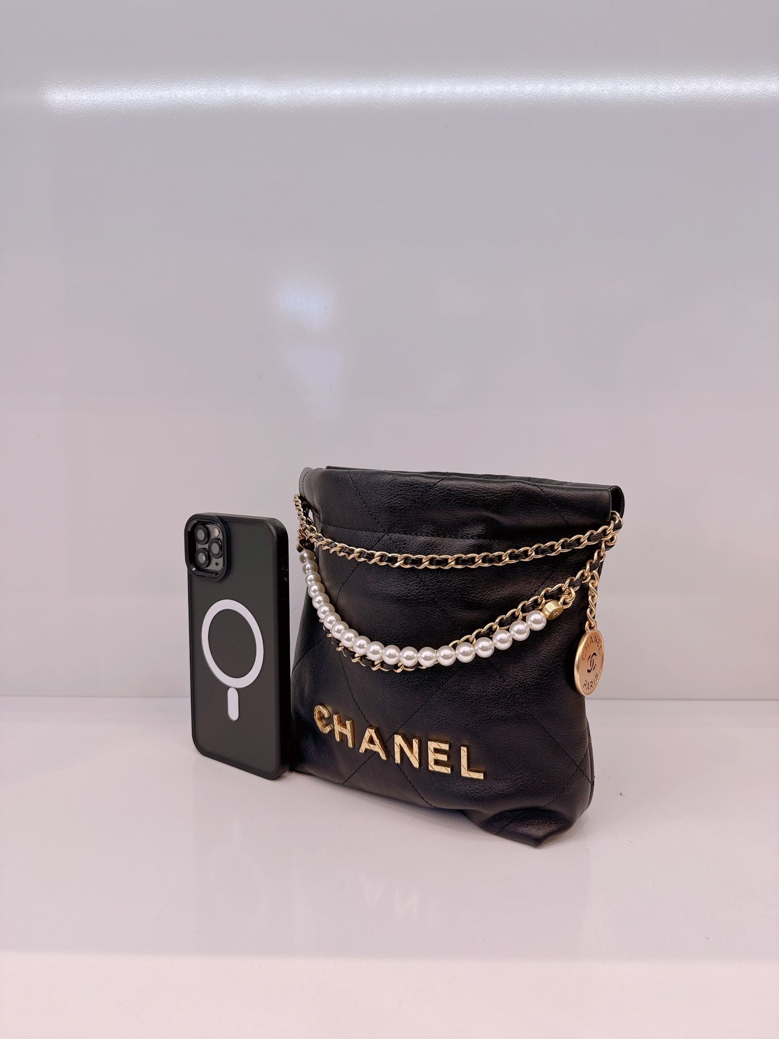 BLACK QUILTED LEATHER MINI CHANEL 22 CHAIN BAG