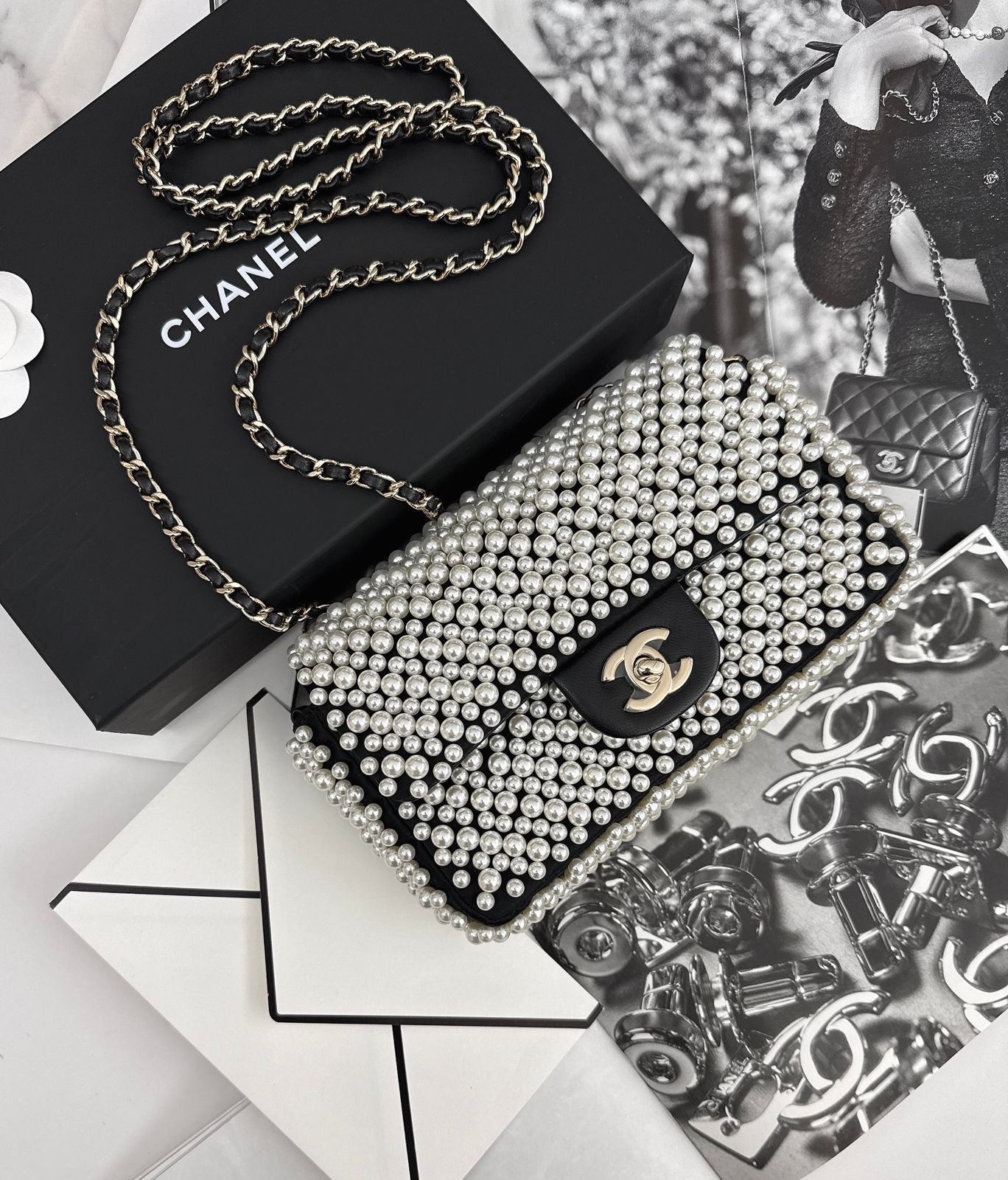 BLACK SATIN AND LAMBSKIN PEARL 19S MINI RECTANGULAR FLAP BAG LIGHT GOLD HARDWARE