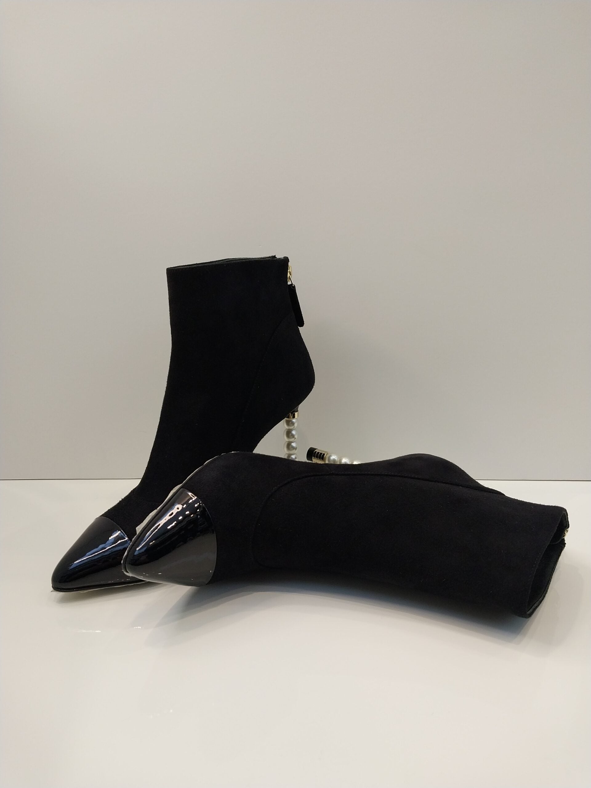 BLACK SUEDE & PATENT LEATHER PEARL ANKLE BOOTS