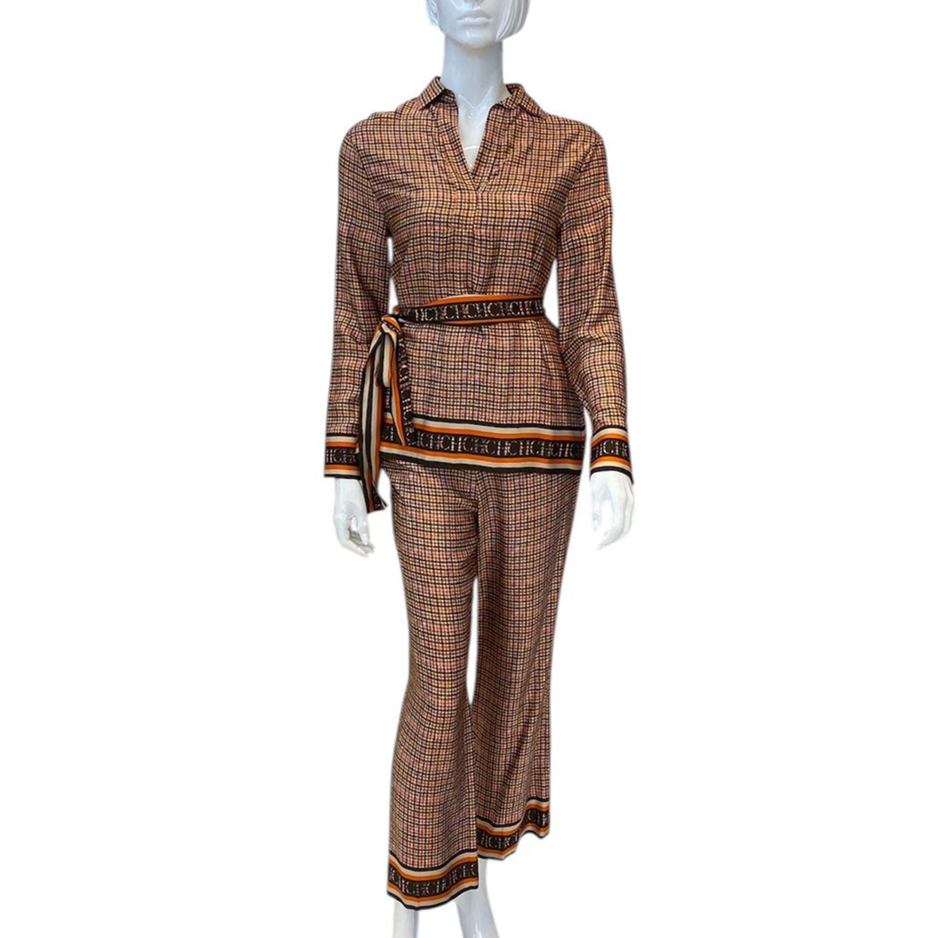 BROWN ORANGE CHECK SILK BLOUSE AND TROUSER SET XS/2