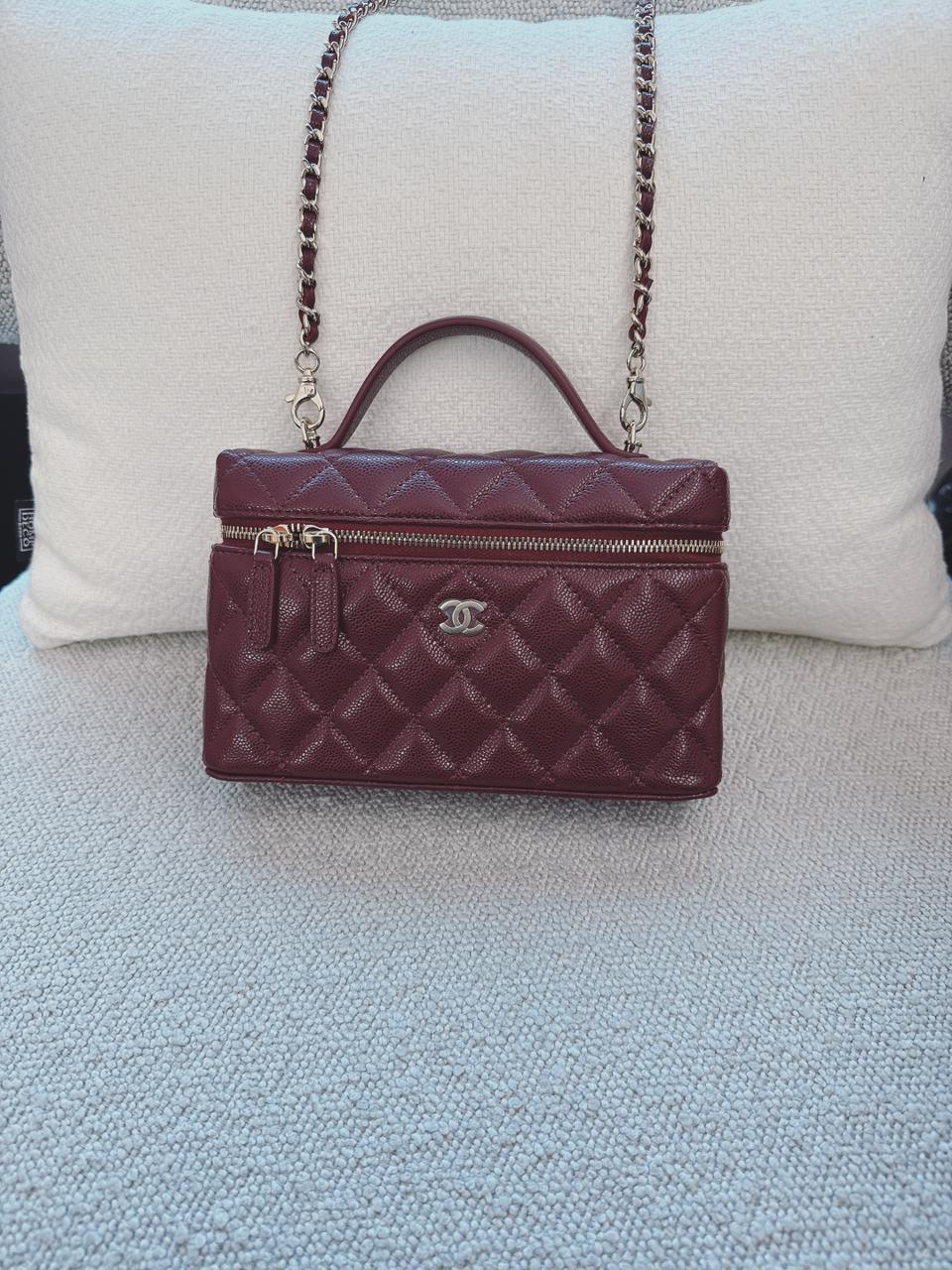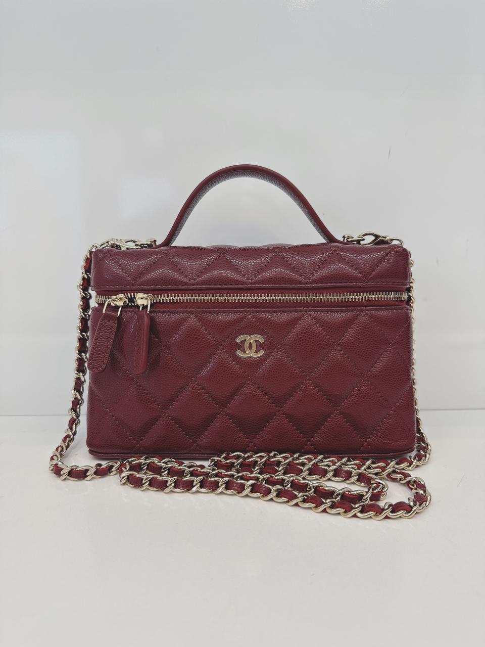 BURGUNDY GRAINED SHINY CALFSKIN AND GOLD TONE METAL CLASSIC VANITY WITH CHAIN