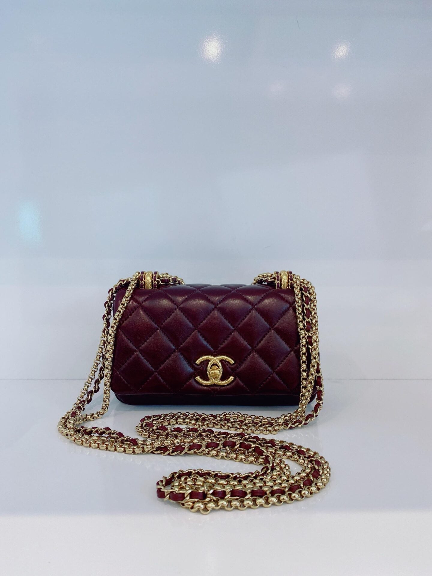 BURGUNDY LAMBSKIN COCO MARK MATELASSE 3 CHAIN SHOULDER BAG