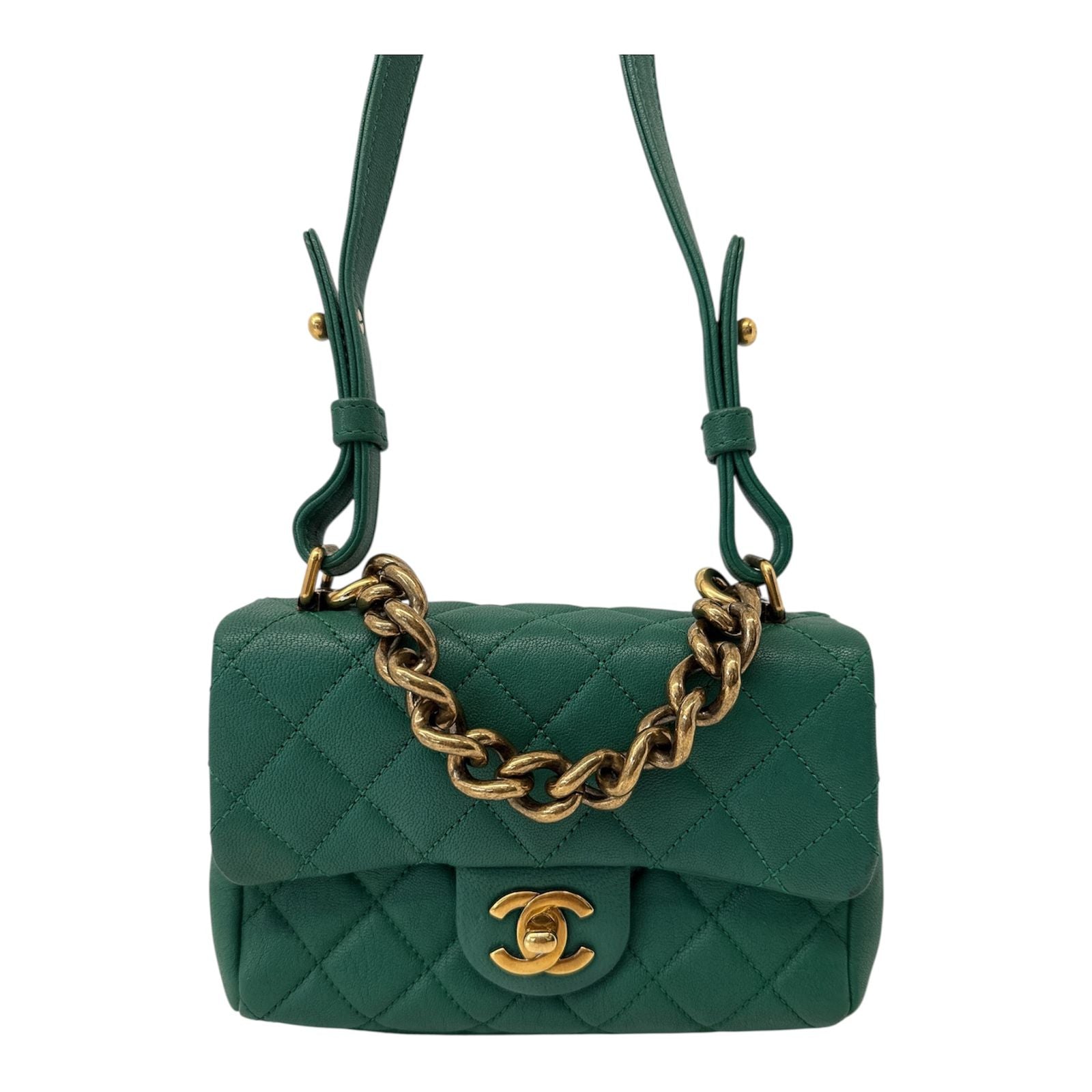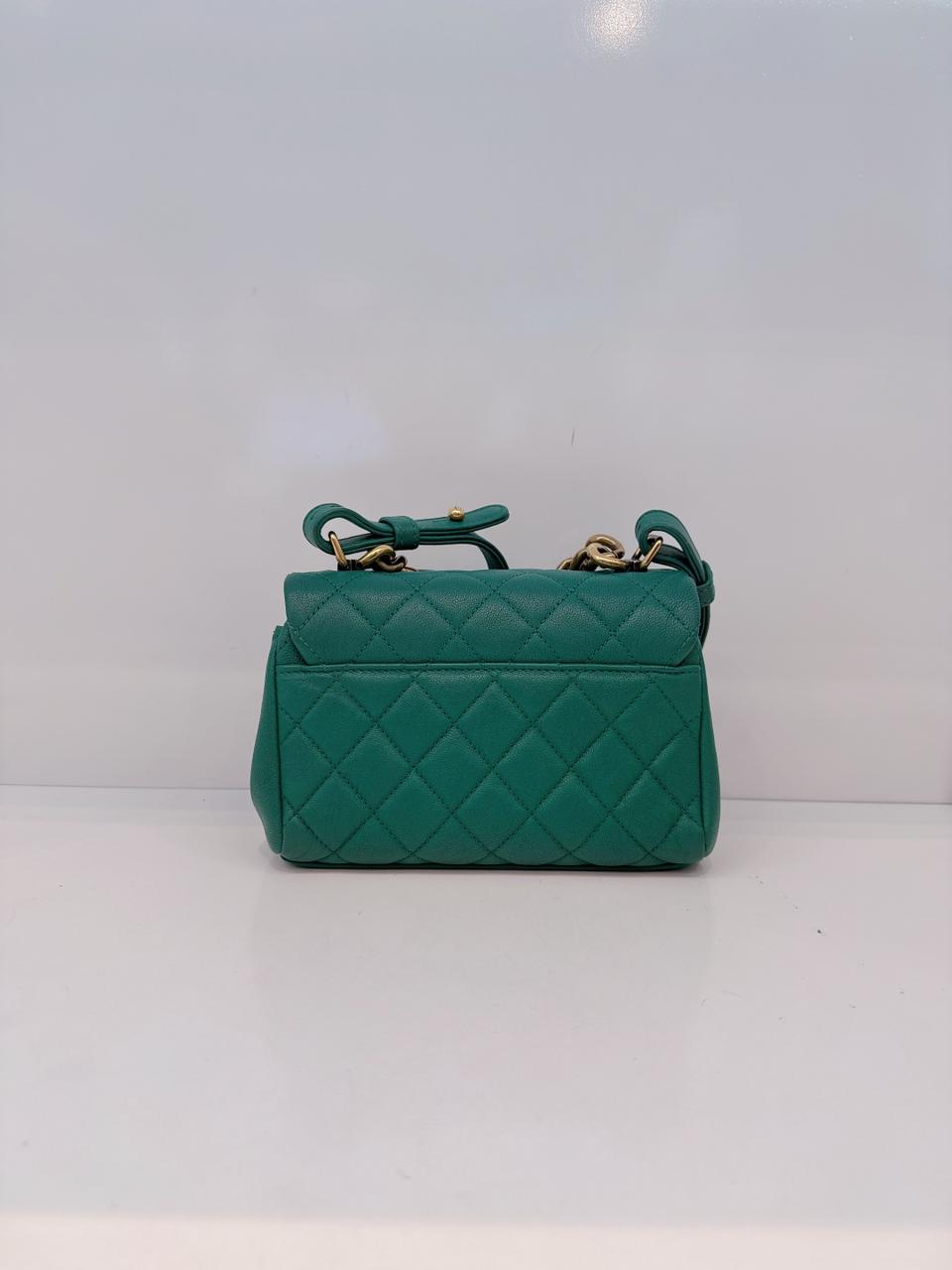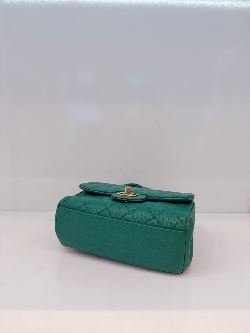 GREEN GOATSKIN TRAPEZIO TOP HANDLE MINI FLAP BAG AGED GOLD HARDWARE