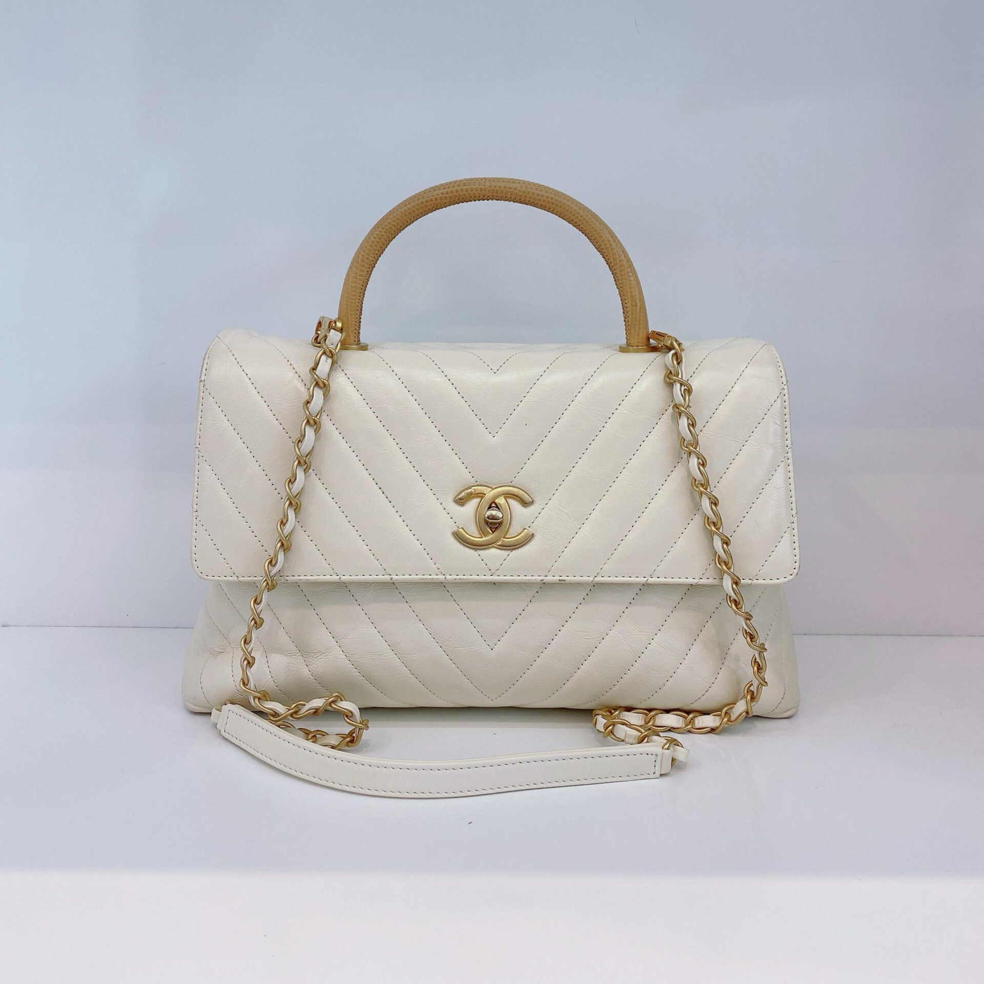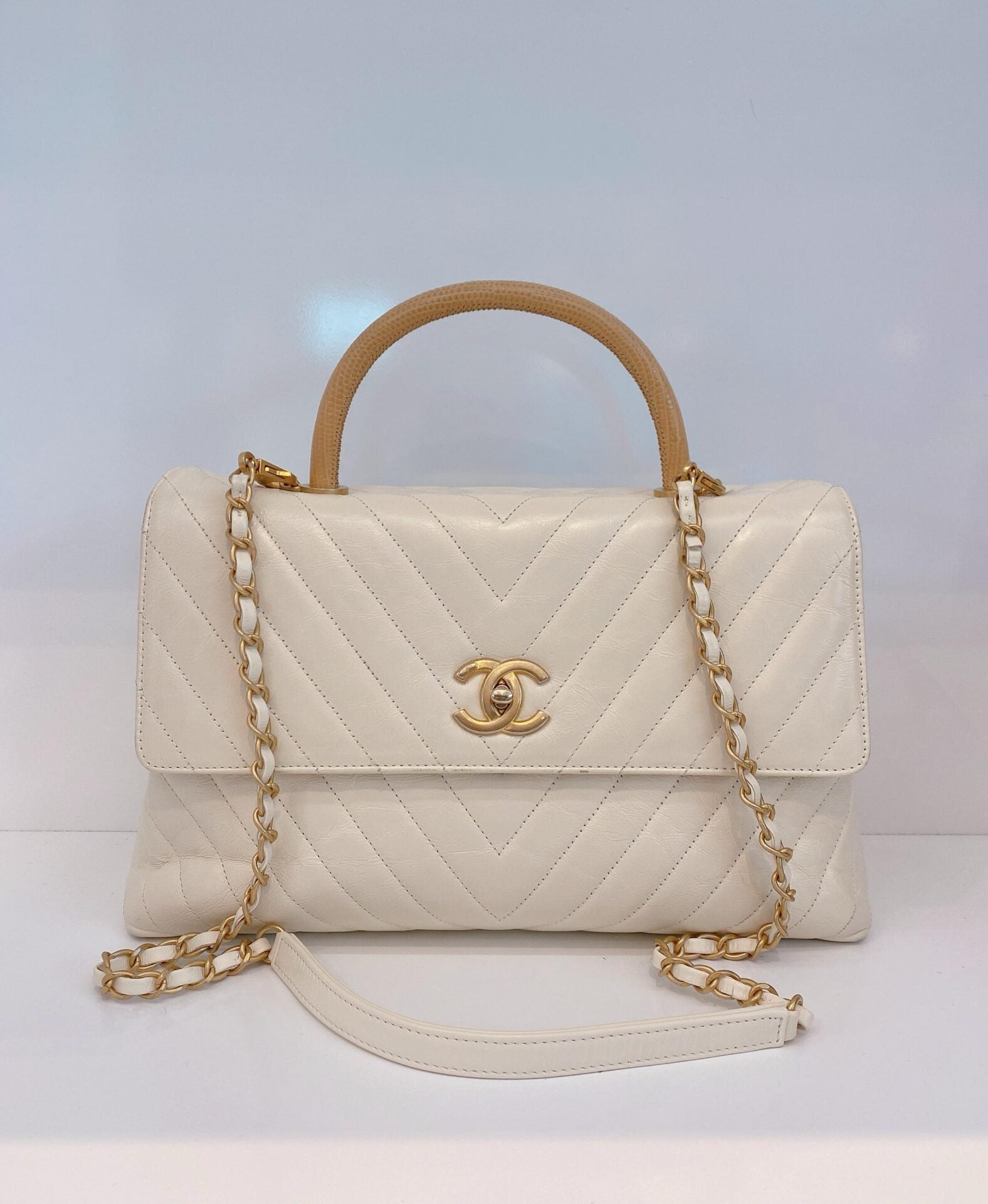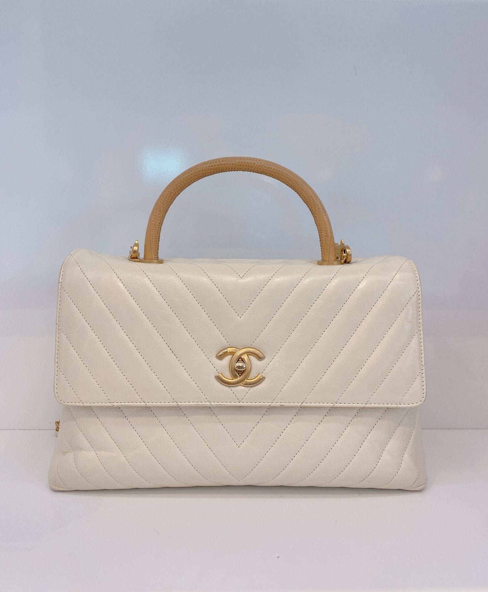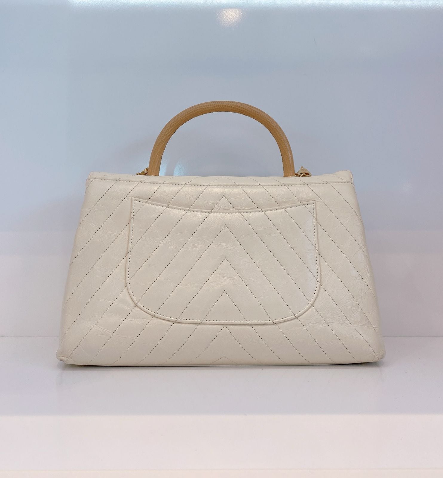 LIZARD COCO TOP HANDLE BAG CHEVRON IN WHITE QUILTED LEATHER