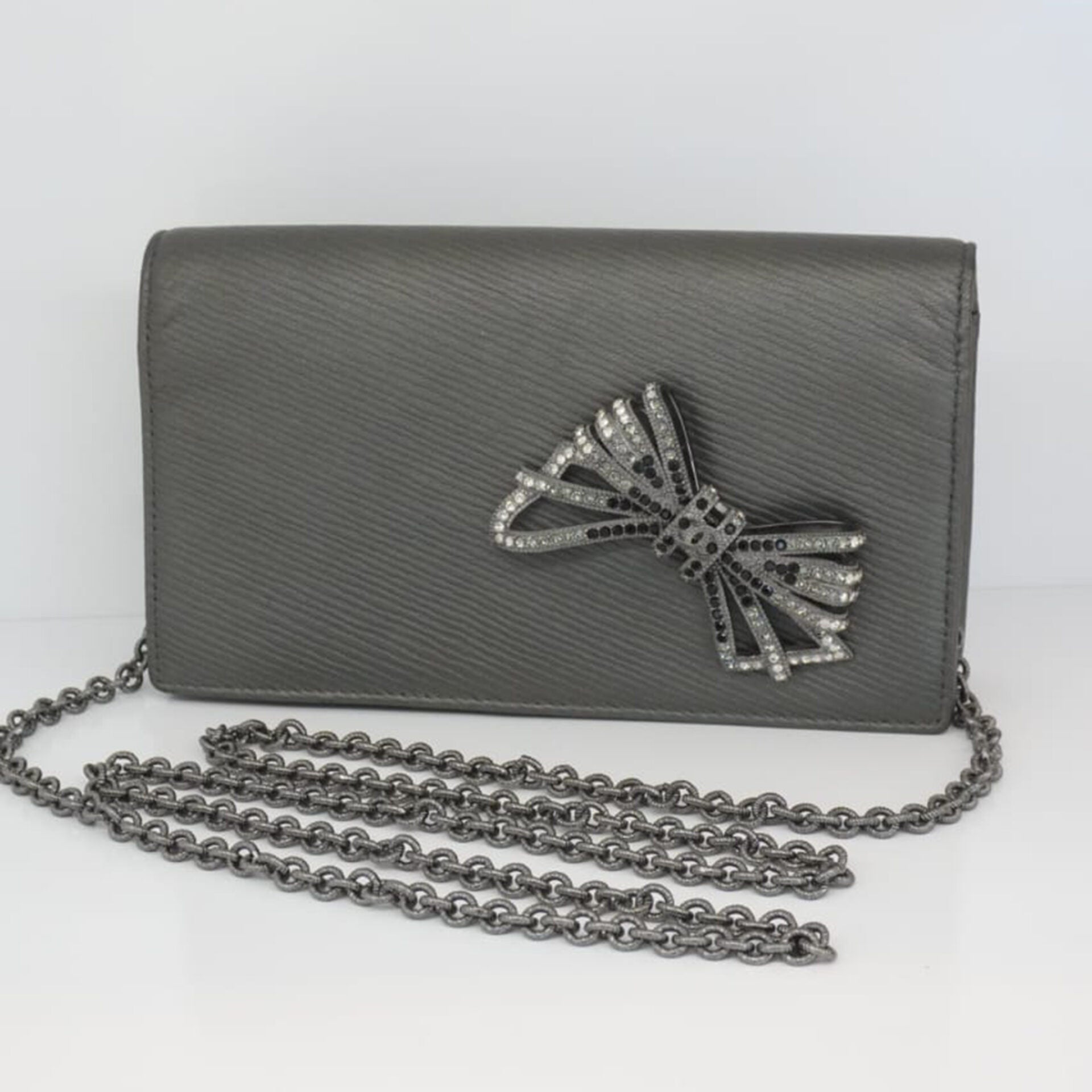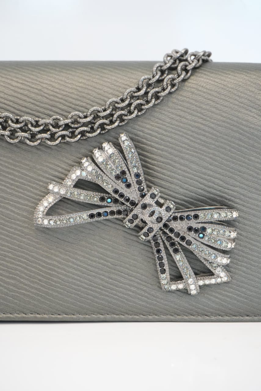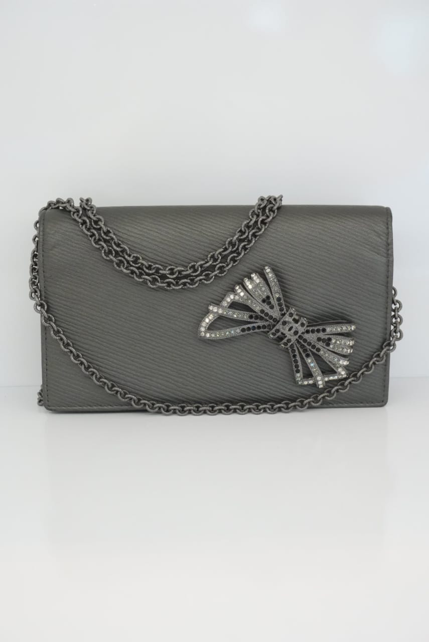 METALLIC DARK GRAY CC CRYSTAL BOW CHAIN EVENING BAG