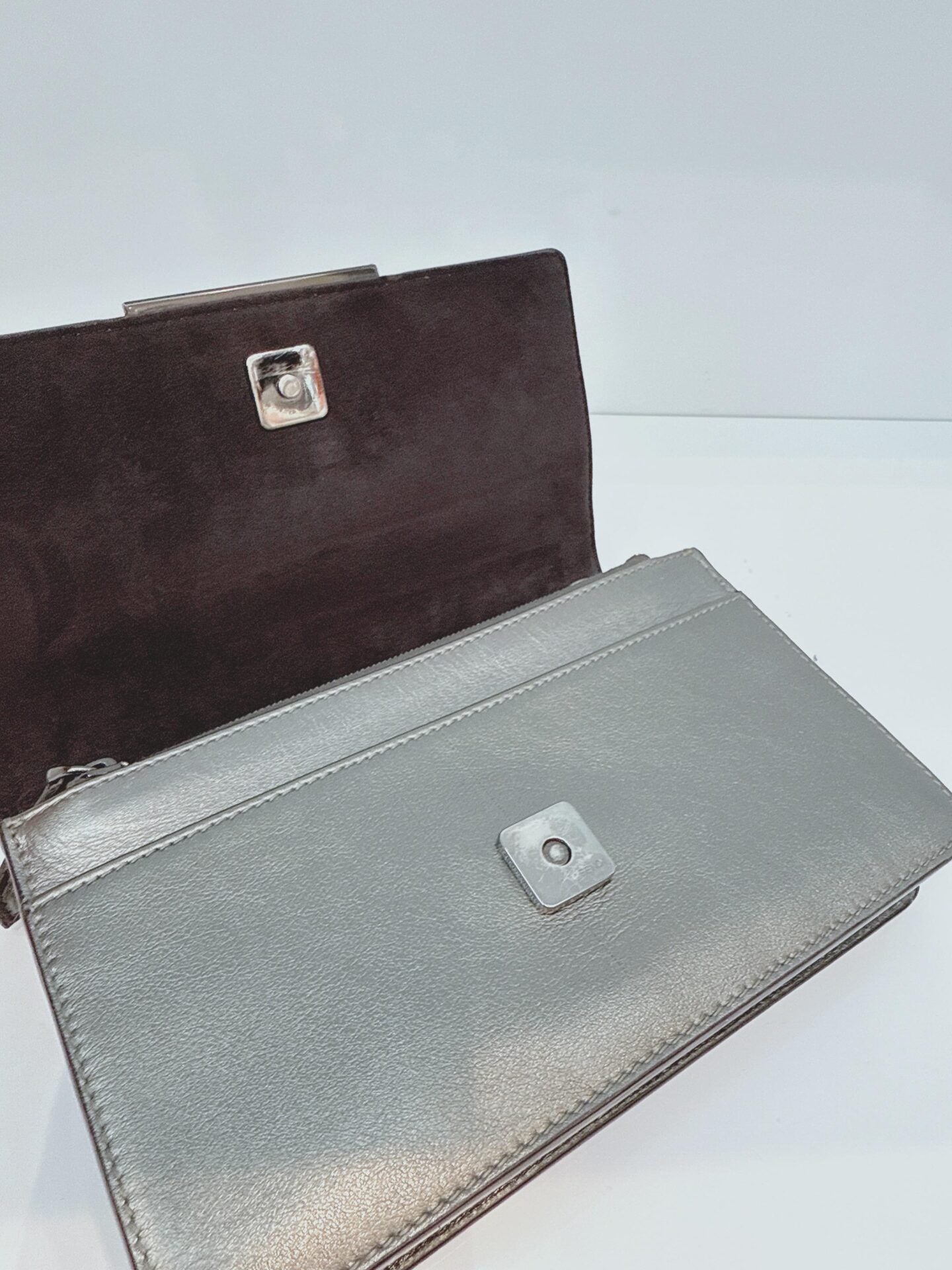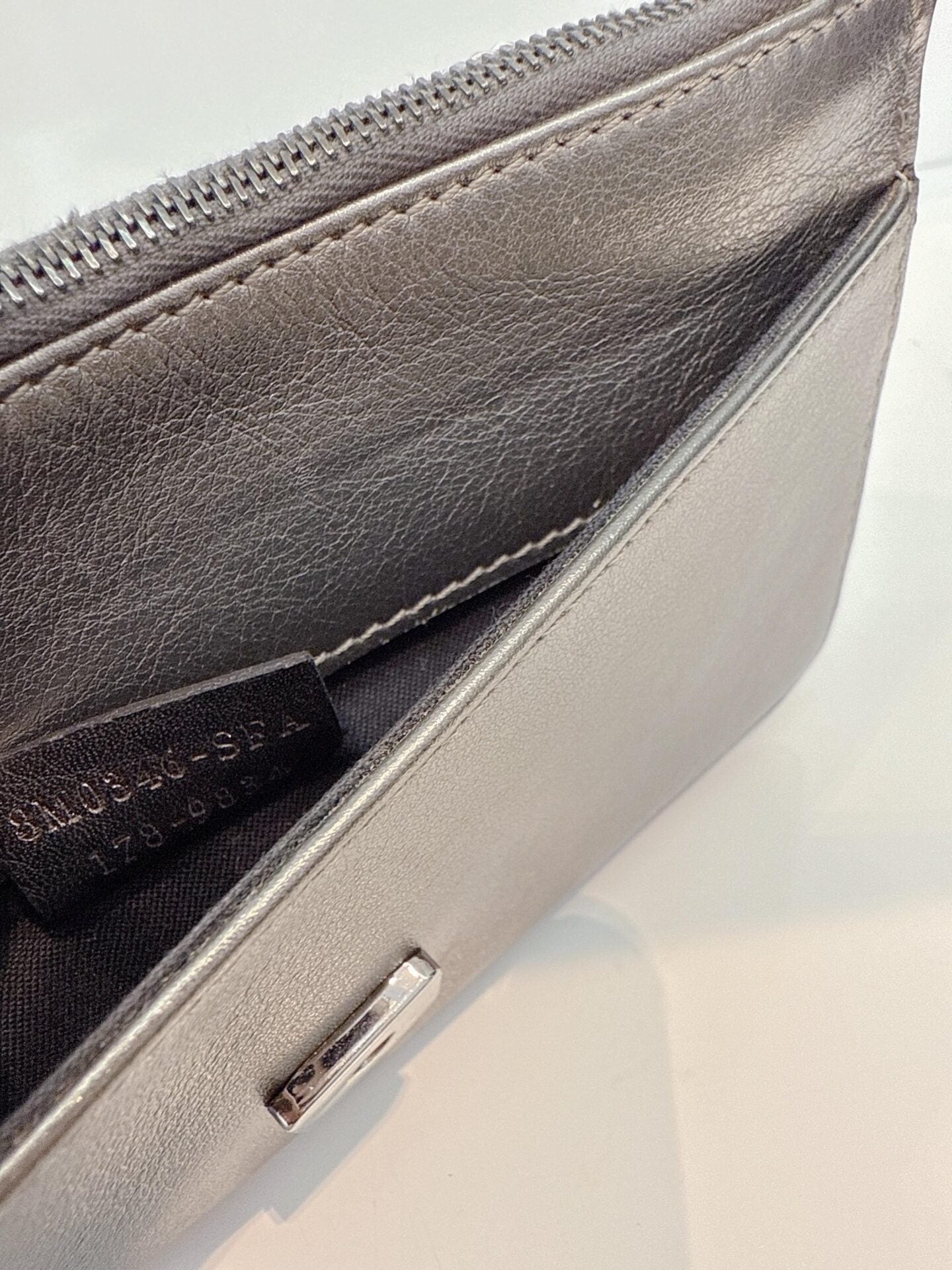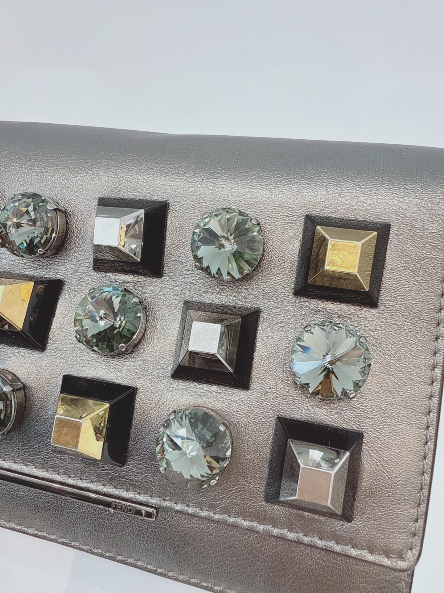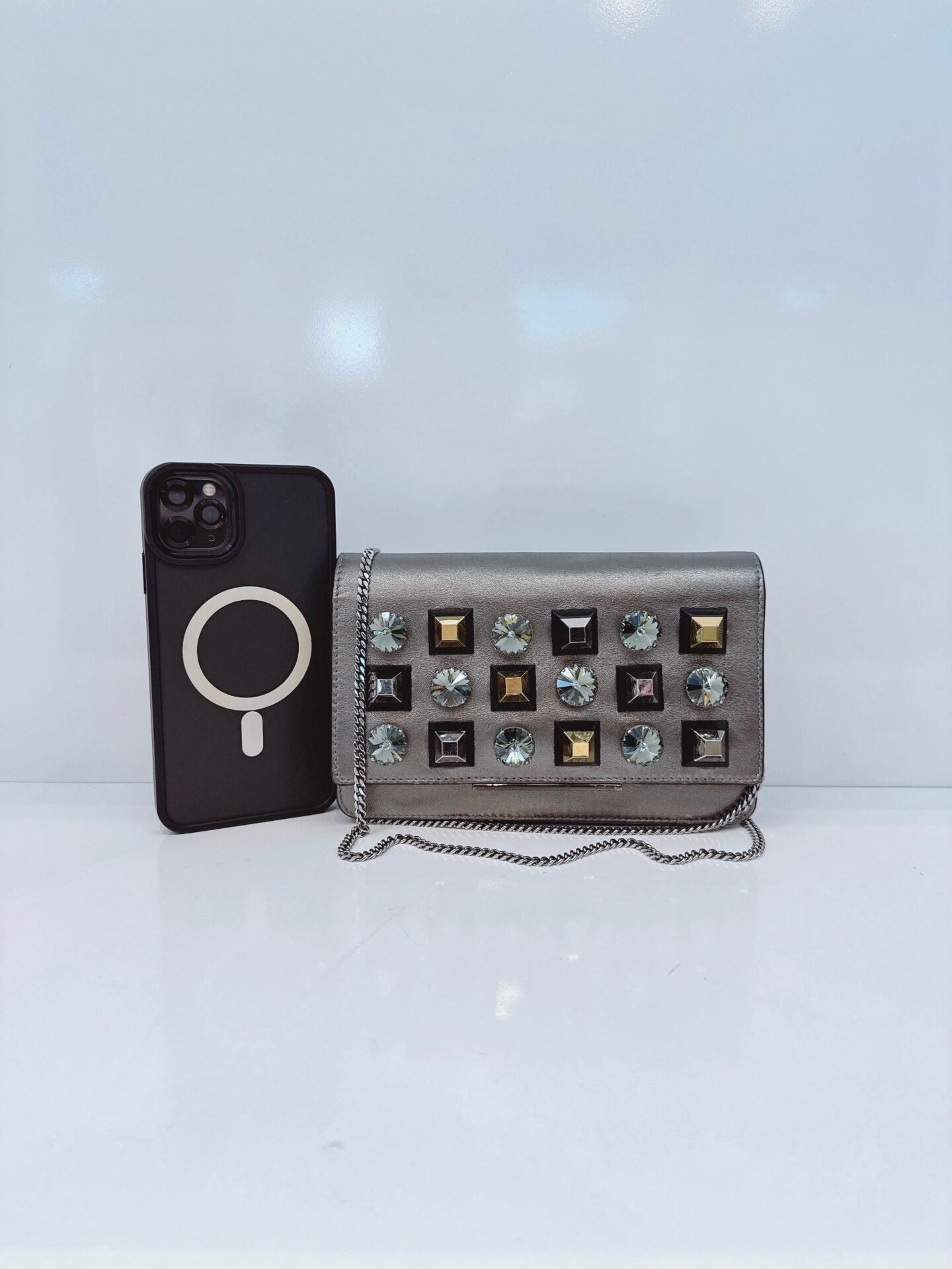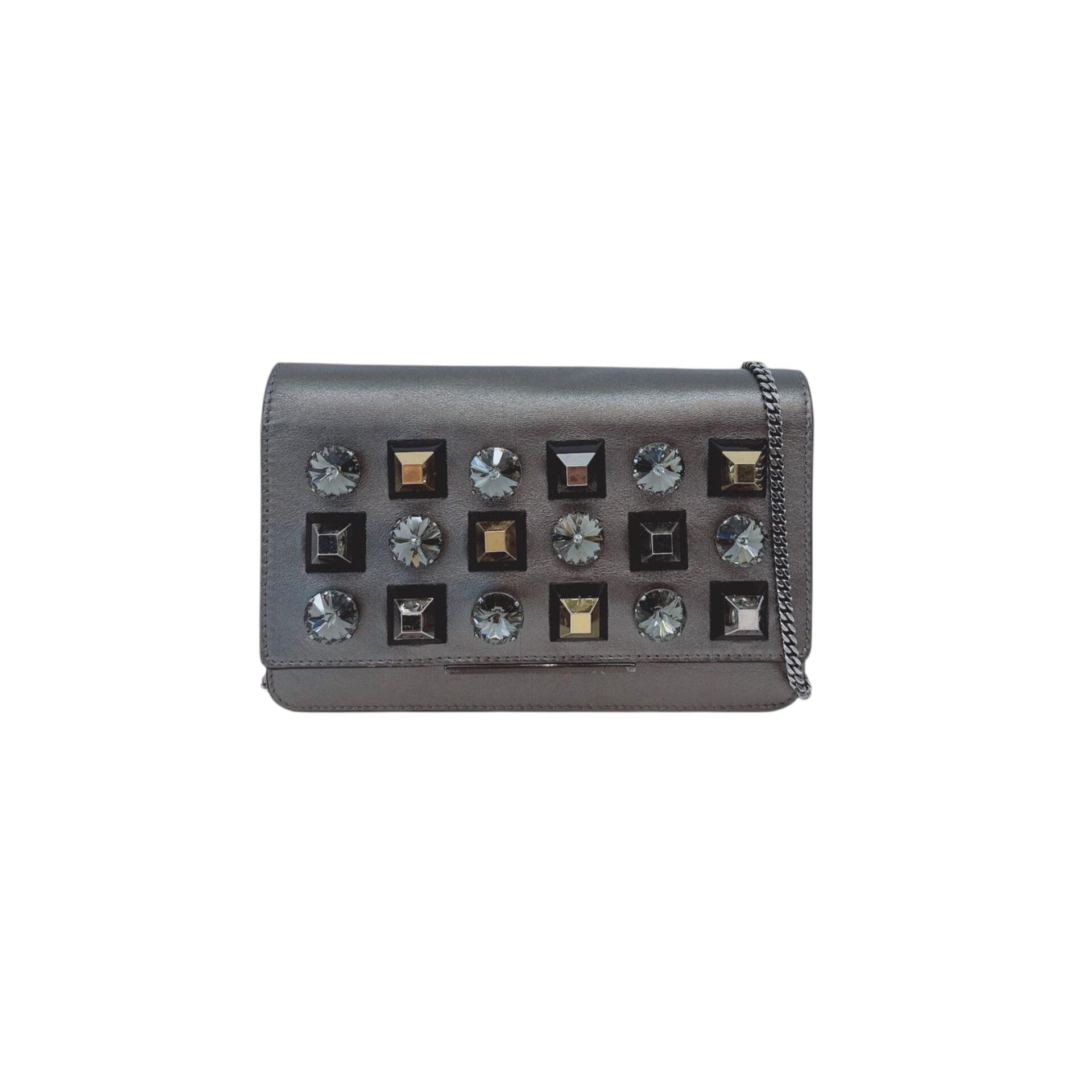 METALLIC DARK GRAY LEATHER CRYSTAL STUD WALLET ON CHAIN