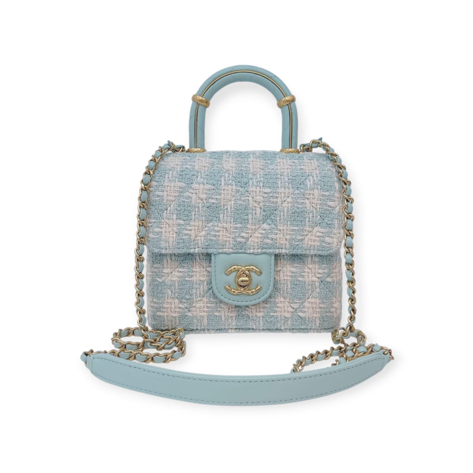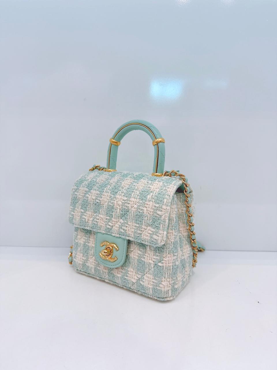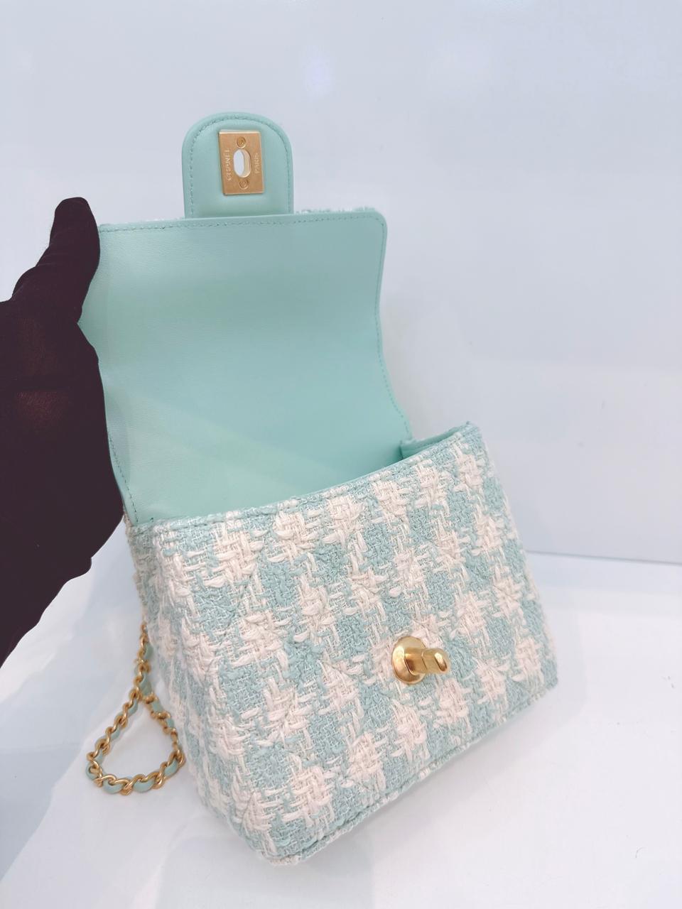 MINI SQUARE FLAP WITH TOP HANDLE - LAMB TIFFANY BLUE ECRU TWEED GOLD HARDWARE