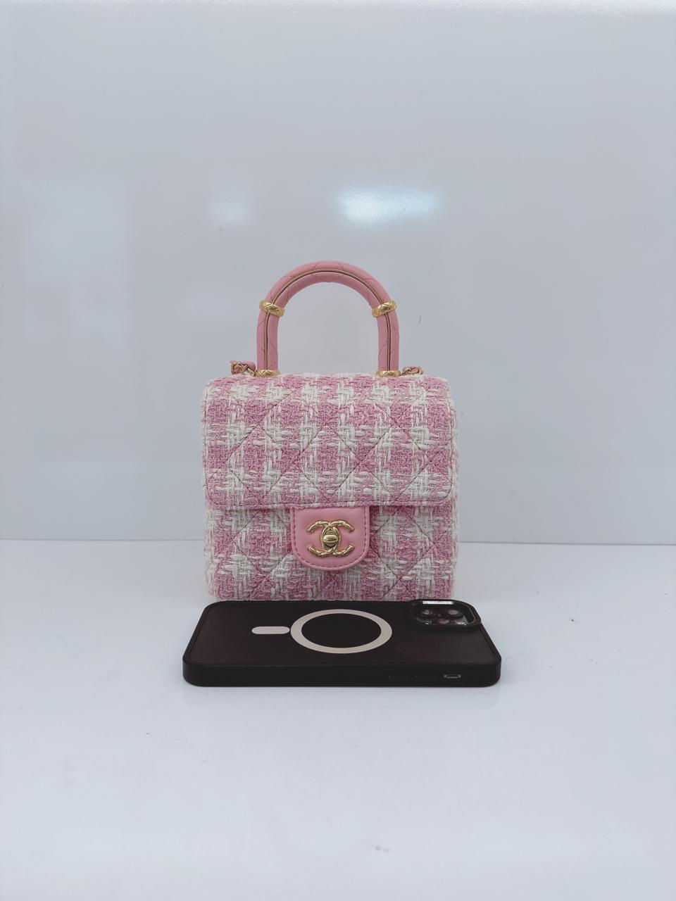 PINK ECRU TWEED HANDLE CRUSH FLAP BAG