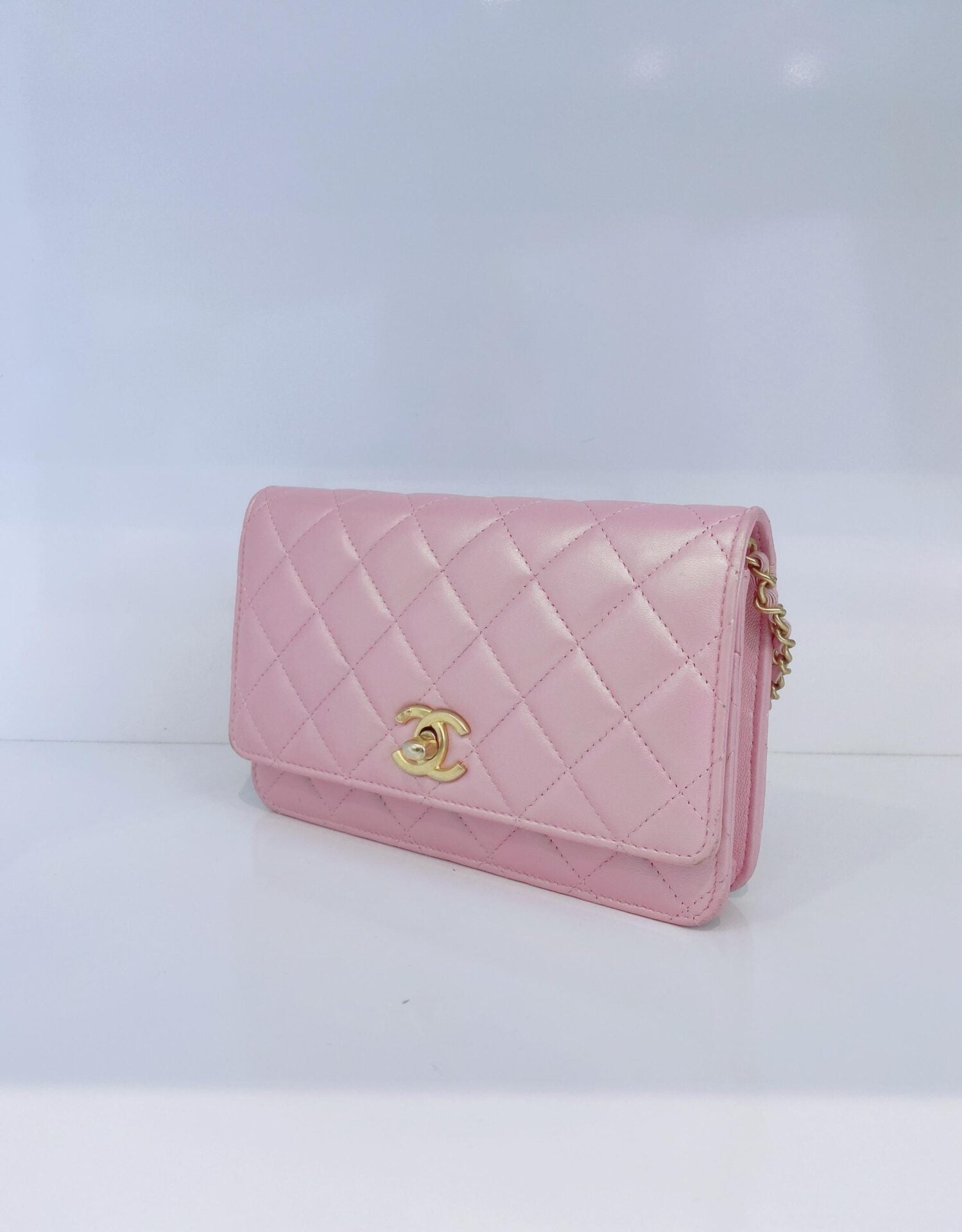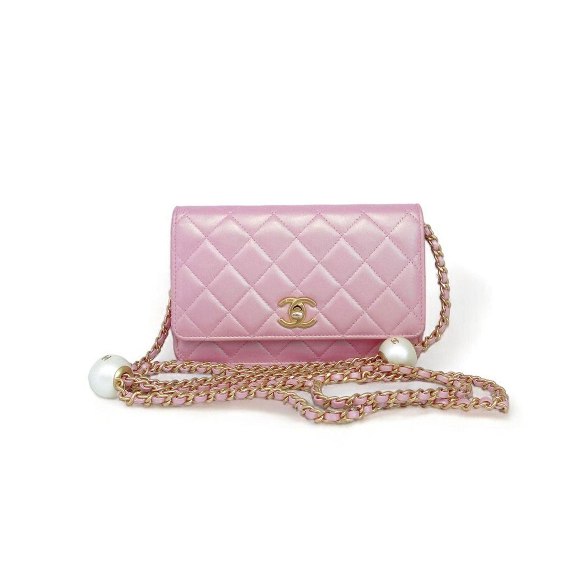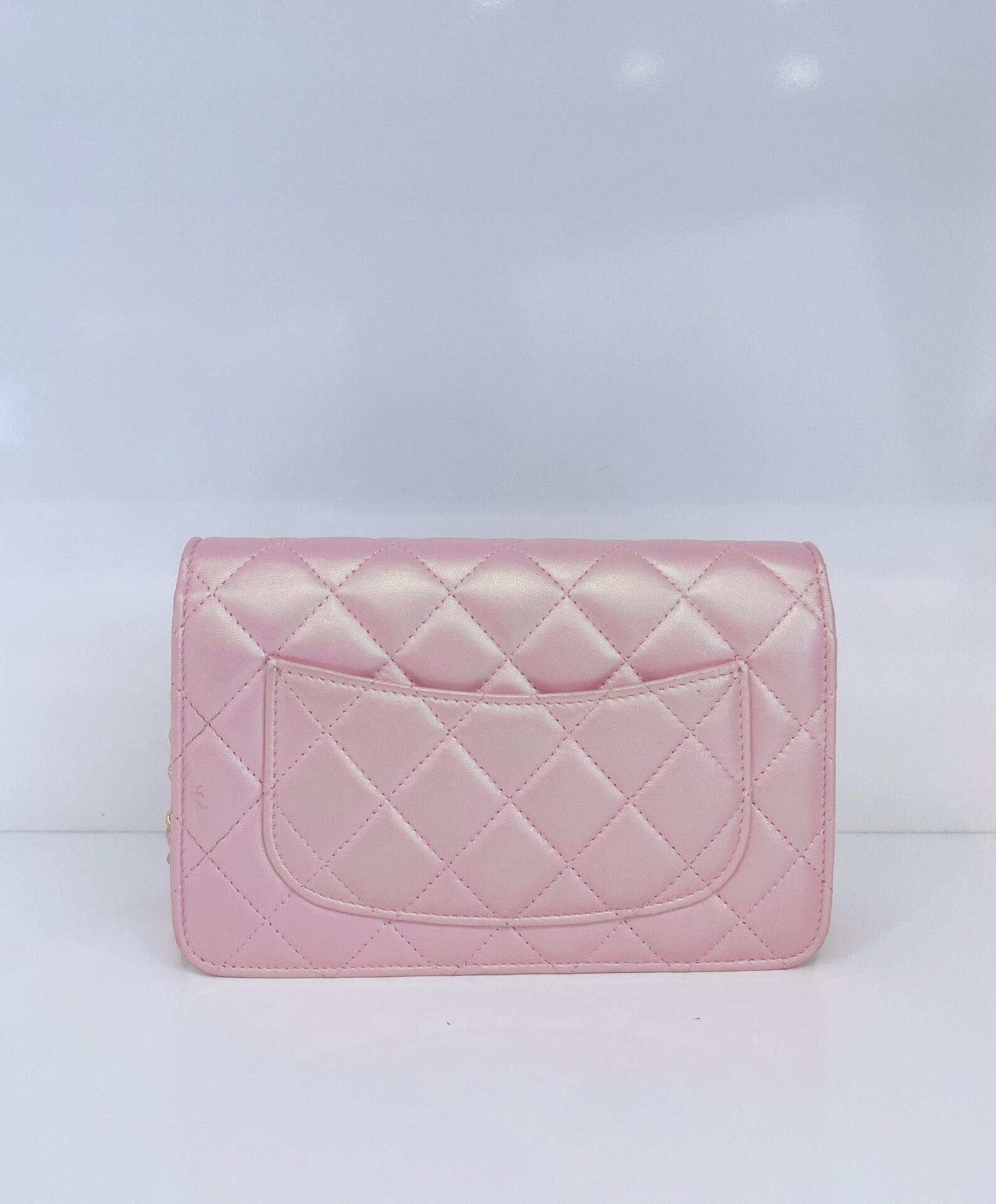 PINK IRIDESCENT LAMBSKIN LEATHER WITH PEARL IMMITATIONS WALLET ON CHAIN