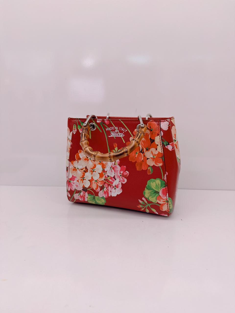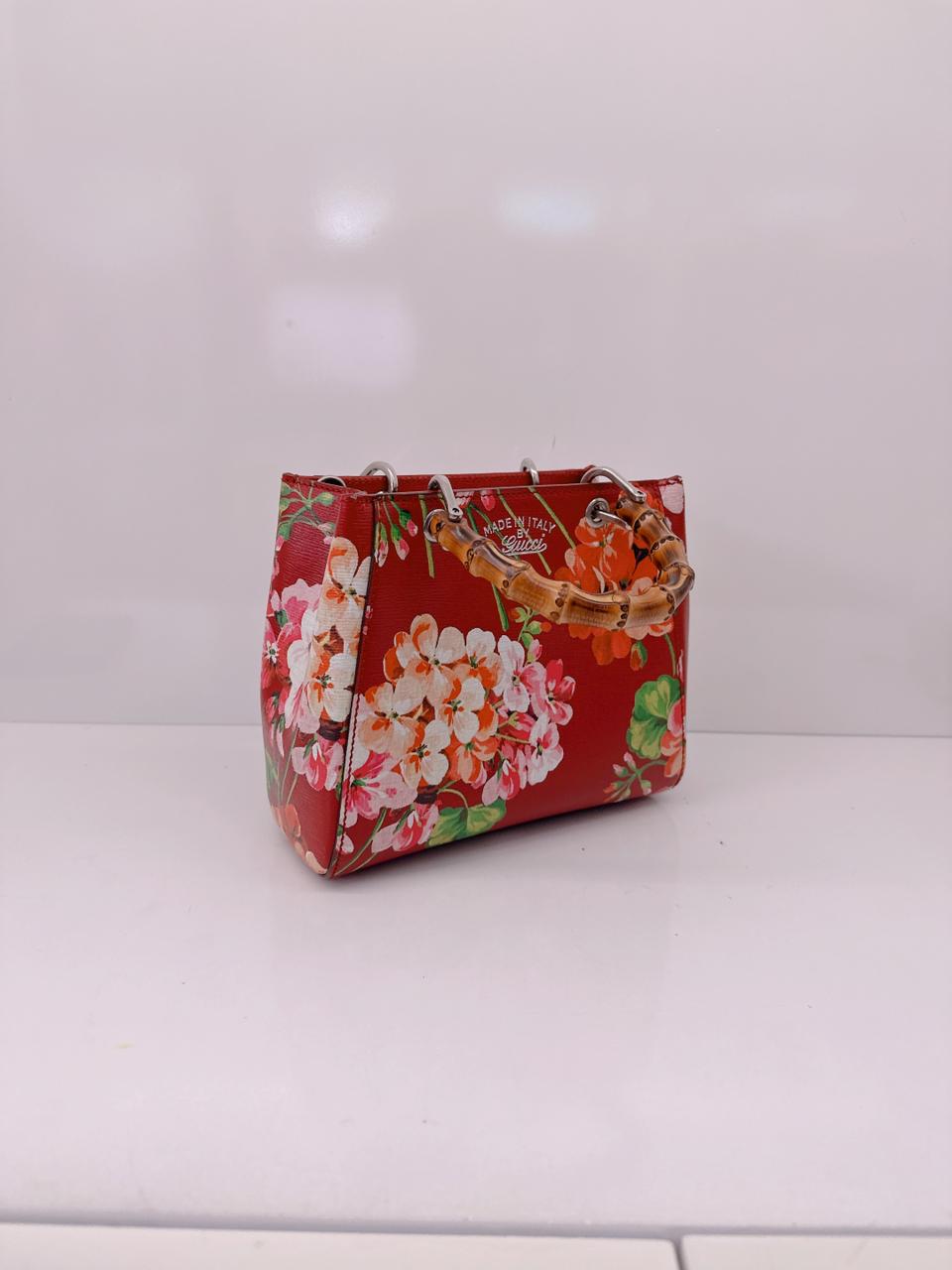 RED MULTICOLOR BLOOMS PRINT LEATHER MINI BAMBOO TOTE
