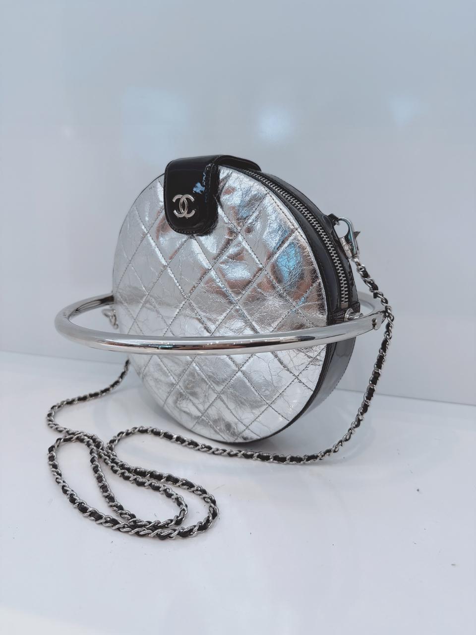 SILVER METALLIC AGED CALFSKIN PATENT PLANET MINAUDIERE SHOULDER BAG