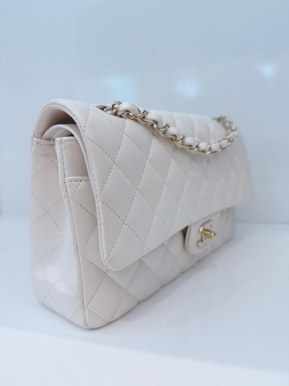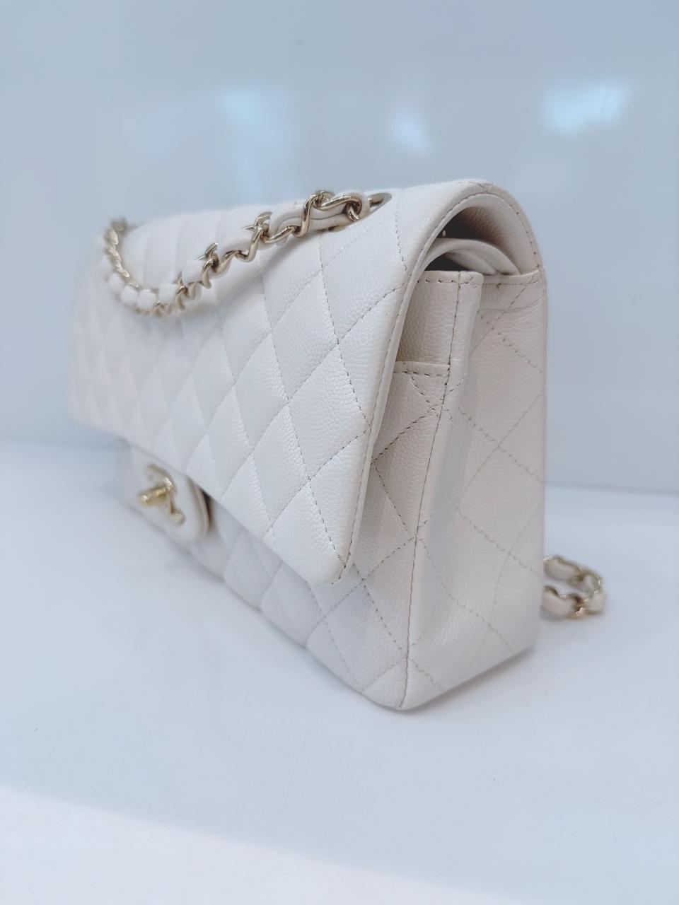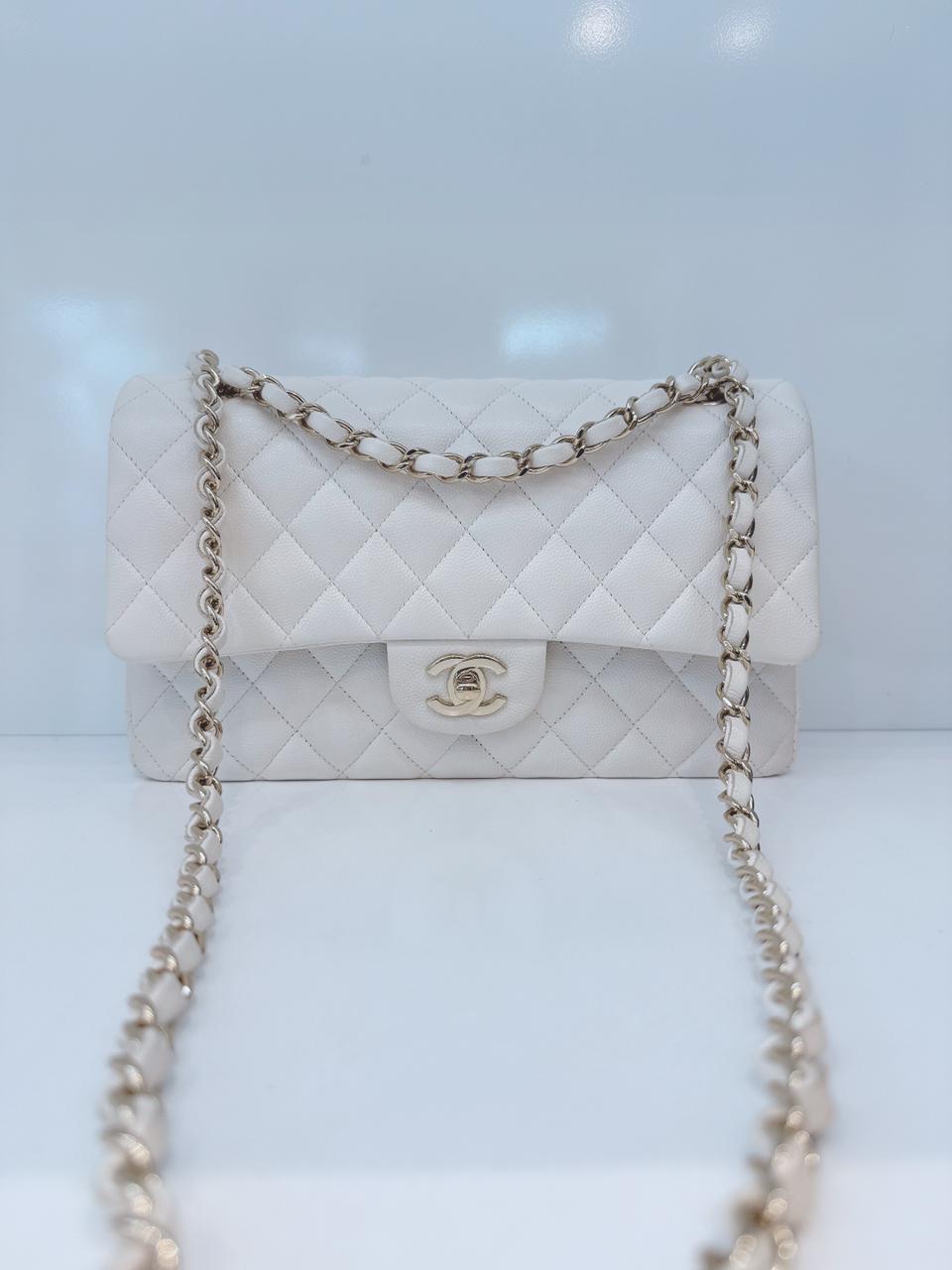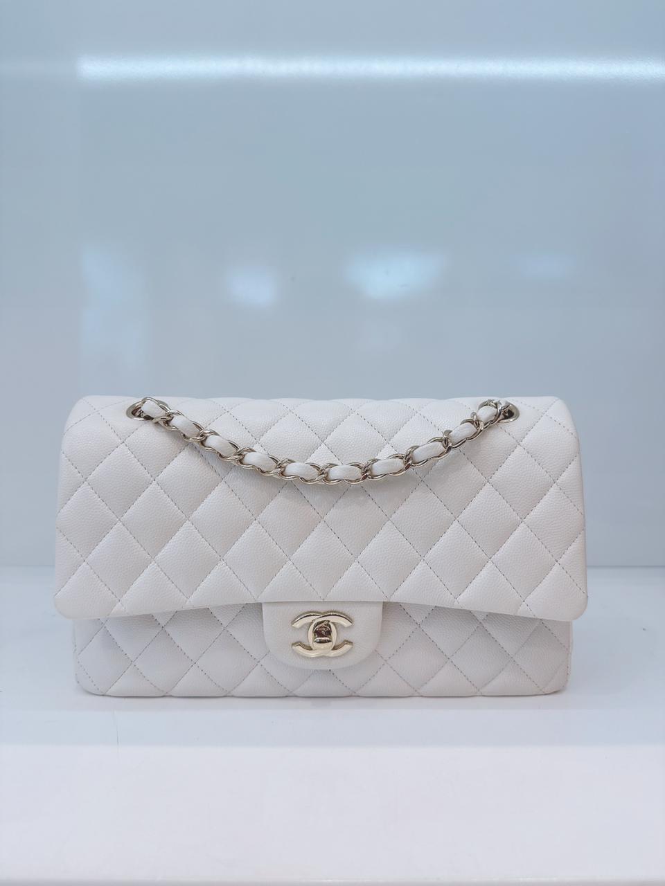 WHITE SHINY CAVIAR LEATHER MEDIUM CLASSIC DOUBLE FLAP BAG